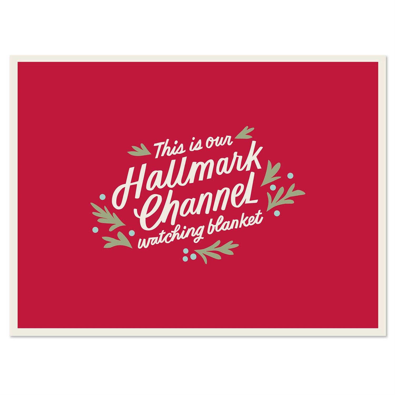 - Cream text on blanket reads: “This is our Hallmark Channel watching blanket.”.
