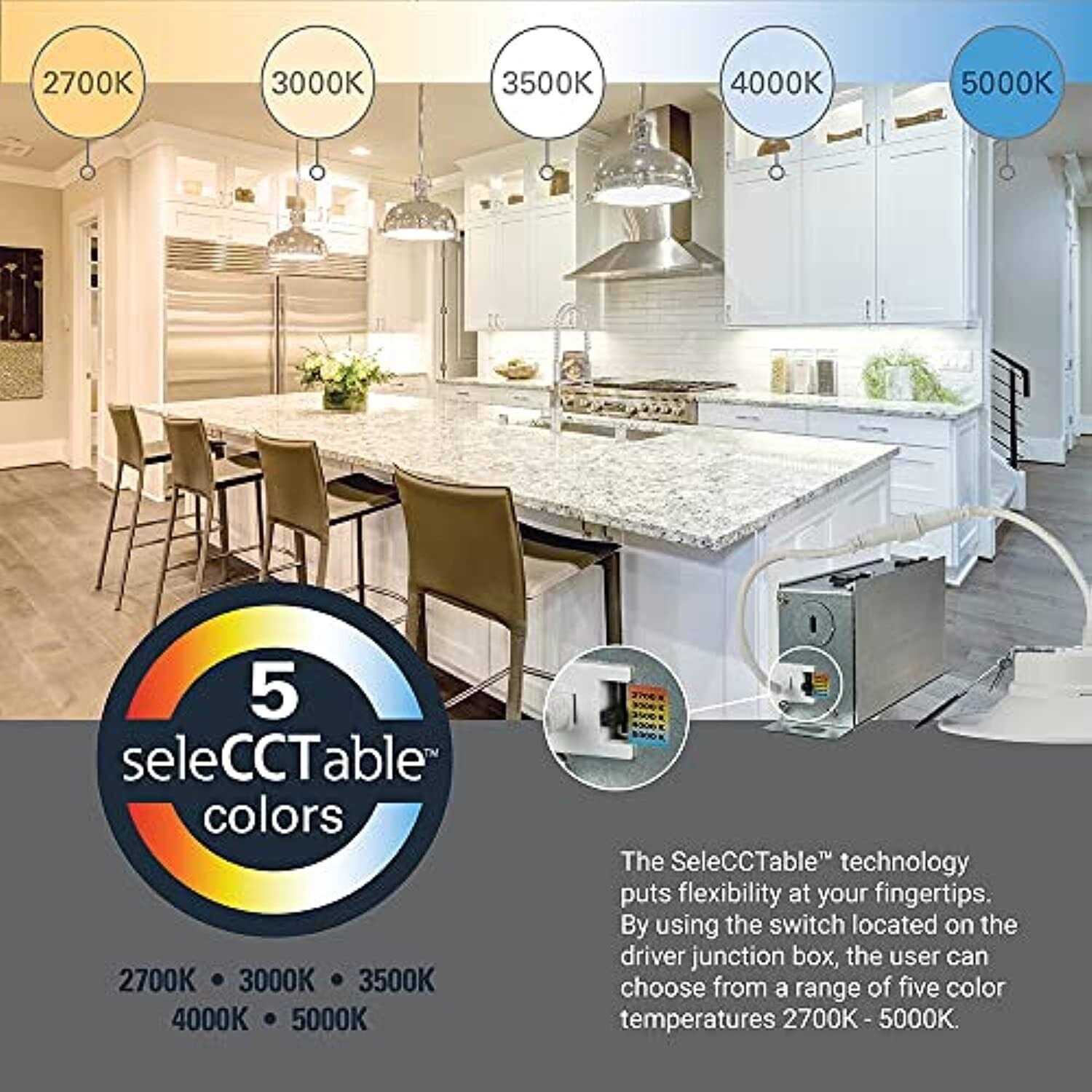 - 2700, 3000, 3500, 4000 and 5000 K field selectable CCT