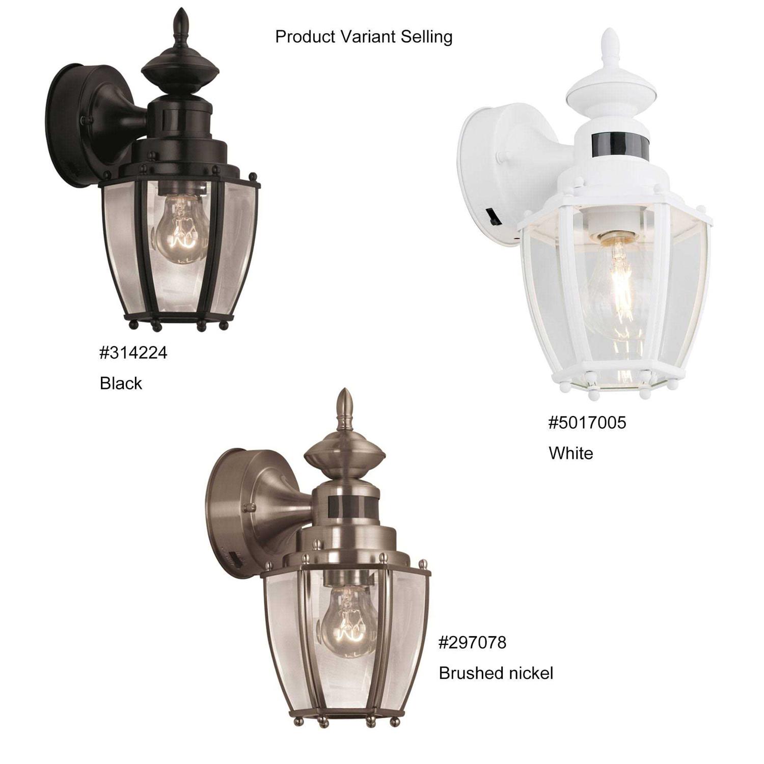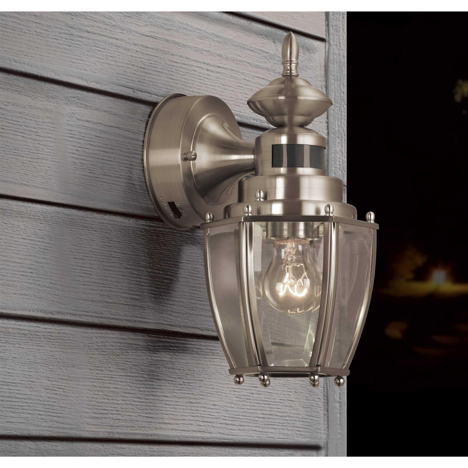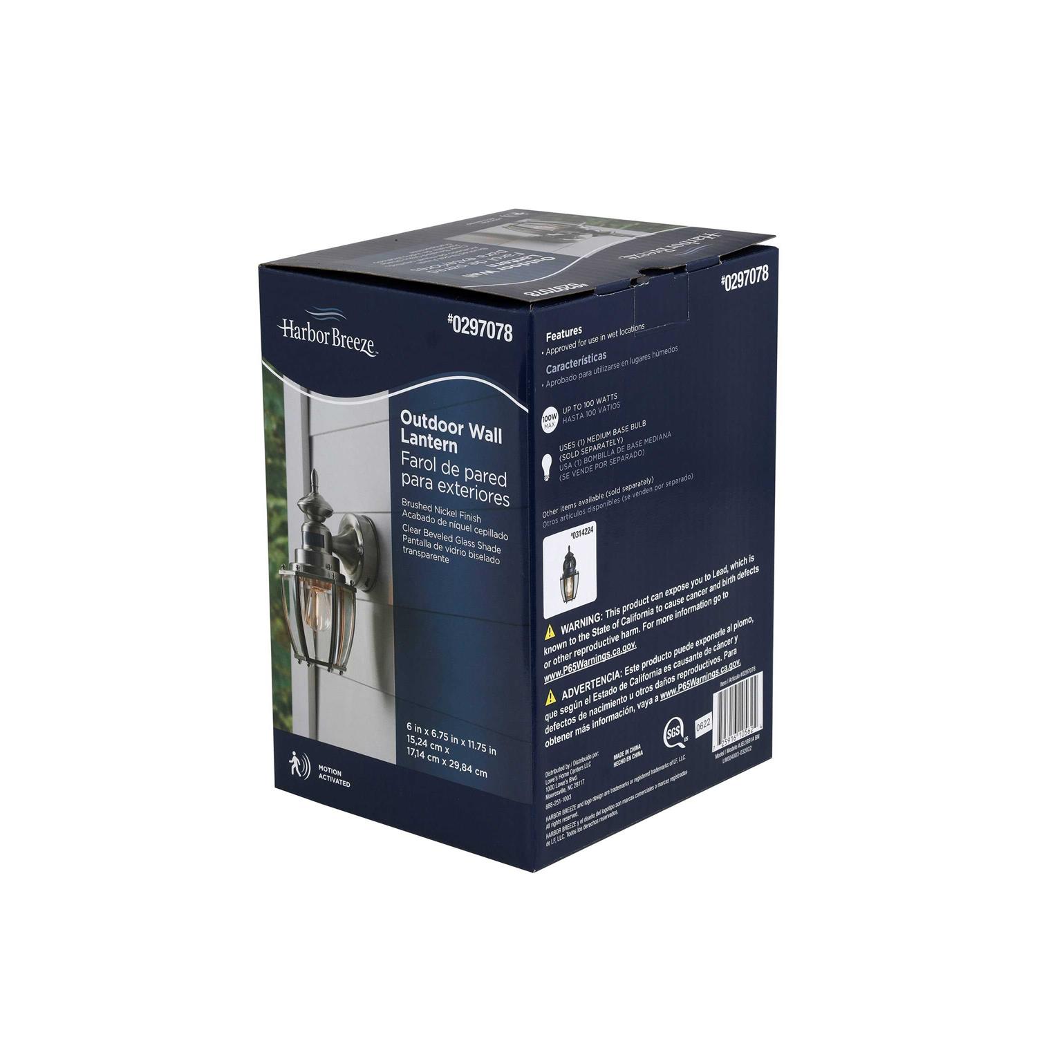 Brushed nickel finish outdoor wall light is weather-resistant and sturdy. Clear beveled glass allows for brightly illuminating your outdoors. One 100 watt medium base incandescent bulb required (not included). Motion-activated sensor detects movement, automatically turning the light on. Built-in photocell prevents daytime activation for convenience and energy savings. 6-In W x 11.75-in H x 6.75-in D. UL safety listing demonstrates this product has met minimum requirements of widely accepted product safety standards. Great for traditional style decor. Wet location rated.
