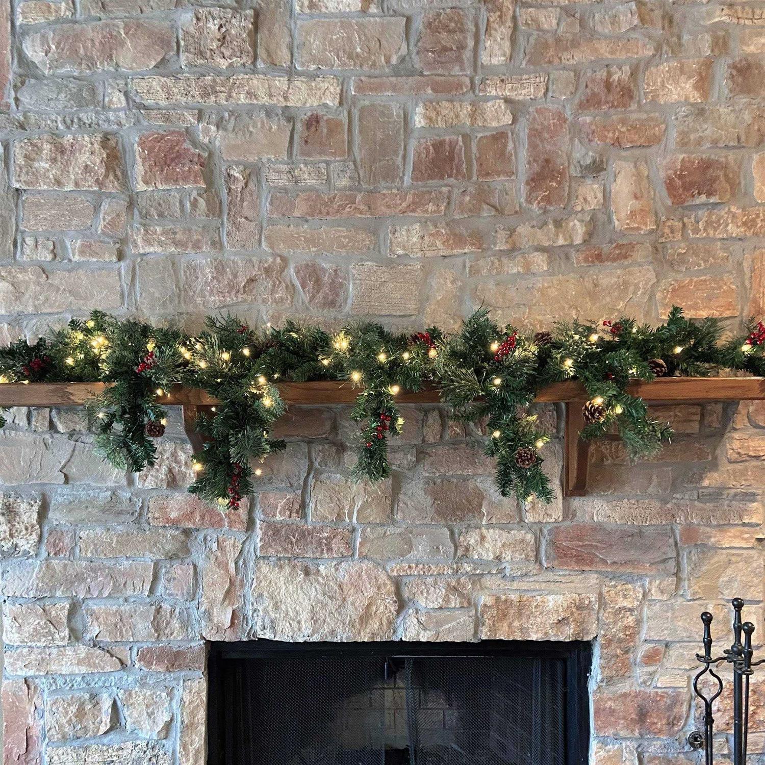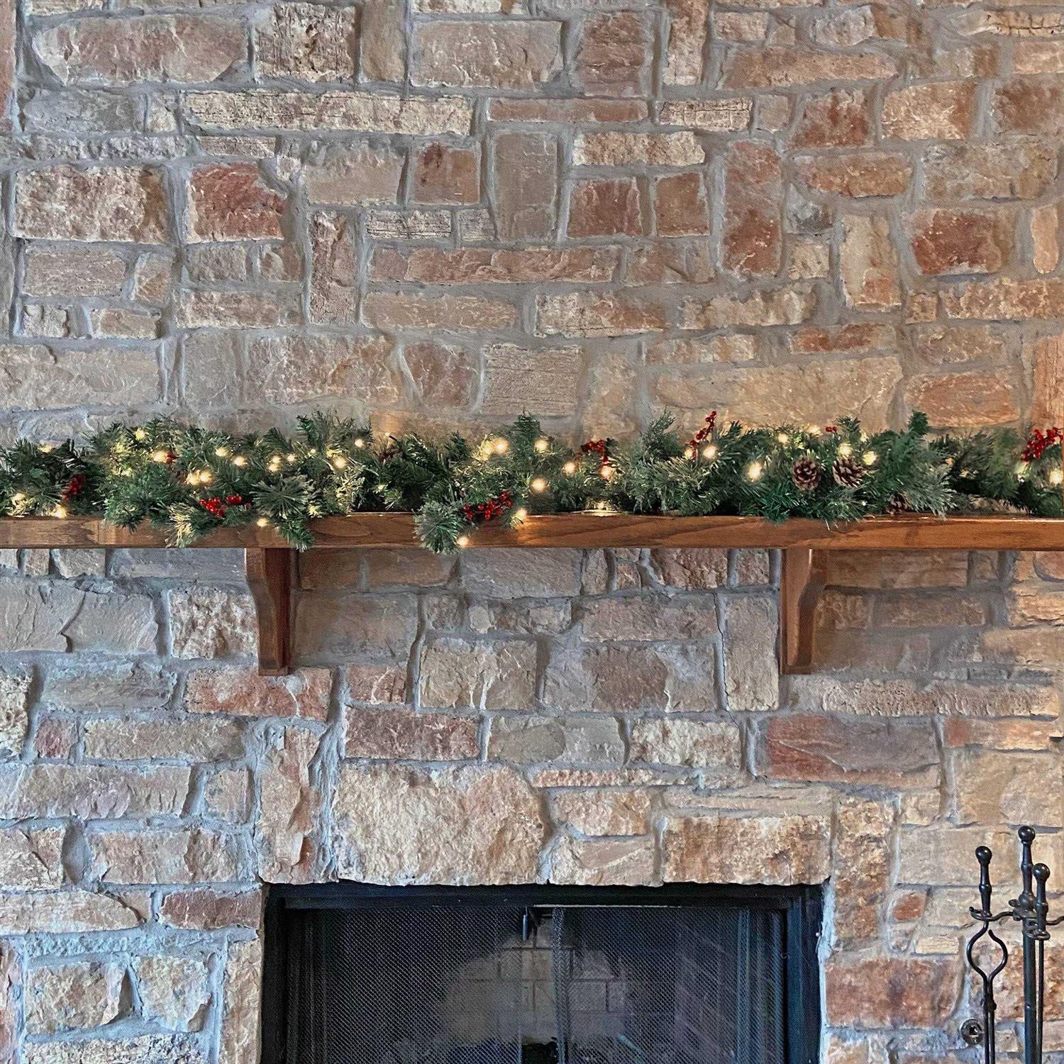 Adorn your mantel with a stylish Classic Christmas Swag that cascades with style! This 6′ long Mantle Swag showcases an assortment of lush, mixed greenery, faux berries, and real pinecones. The PVC mixed greenery has 9 cascading branches that are spaced evenly so stockings and faux candles can still be hung with care! Pre-lit with 100 warm white LED lights this wreath shines brighter than most and has two battery boxes with built-in timer functions that countdowns 6 hours on and 18 hours off. Requires 6 D batteries- not included. Perfect for indoor and outdoor use! Pre-lit with 100 warm white LED lights Features two battery boxes with built-in timer functions that countdowns 6 hours on and 18 hours off. Requires 6 D batteries- not included. Weather safe for indoors or out.