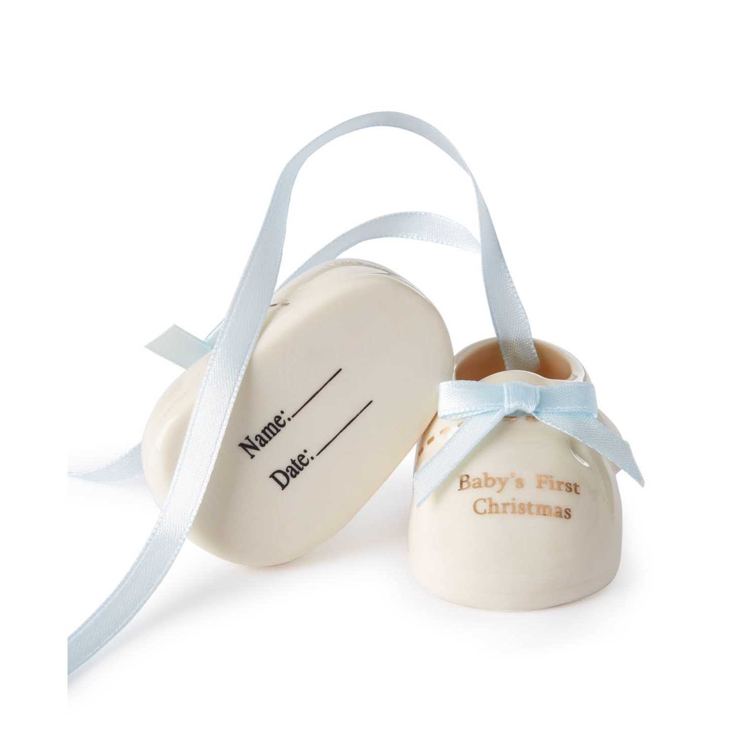 Holiday Lane Babys First Porcelain Blue Baby Shoes Ornament Approx. dimensions: 2.5H 95% PORCELAIN, 5% POLYESTER Spot Clean only