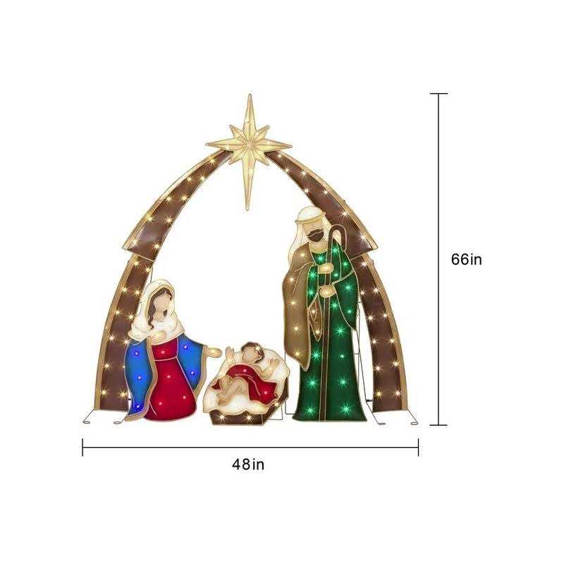 This Holiday Time Light-Up LED Nativity Scene is a great way to remember what the Christmas season is all about. Easy to assemble, the lights are pre-attached to the frames and are collapsible for easy storage. This nativity features iron frames with metal stakes, making it suitable for indoor or outdoor use, and comes with a total of 110 bright LED lights, so you can enjoy an abundance of light throughout the holiday season. The set includes one 66-inch arch, one 42-inch Joseph, one 28-inch Mary, and one 16-inch Jesus. Perfect for porches, patios, yards, and landscaping, this light-up nativity will shine bright all season long.