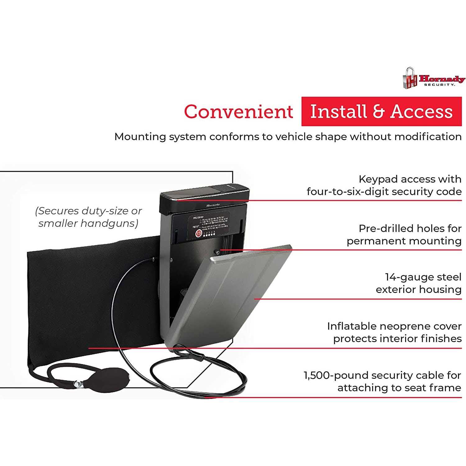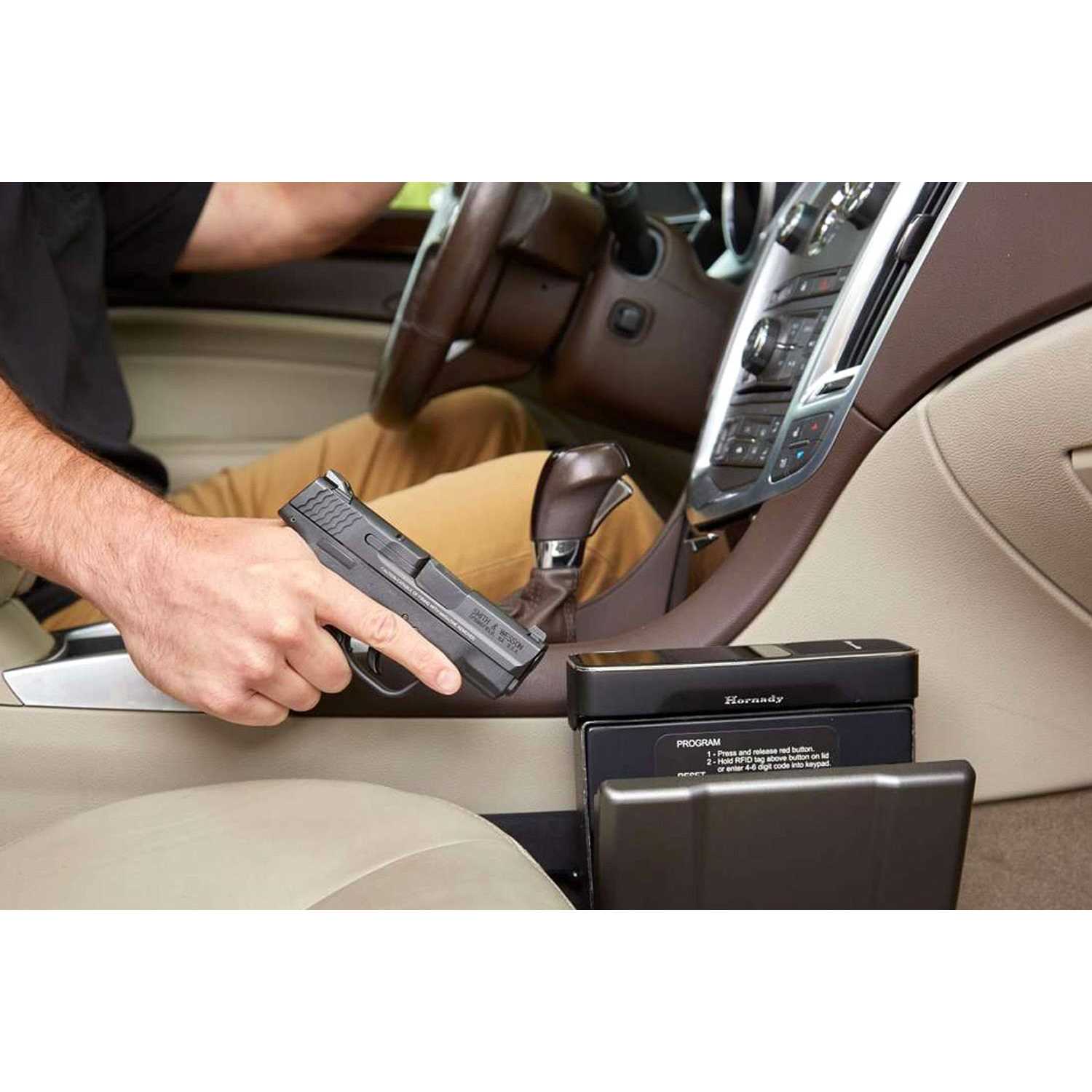 The patent-pending mounting system of the RAPiD Vehicle Safe features an inflatable bladder that conforms to a vehicle interior’s shape, making modifications to the vehicle unnecessary. Power is supplied by the included 12-volt car adapter or four AAA batteries (not included). Exceeds Safety Standards Exceeds ASTM International safety standards for child and pry resistance, lock strength, drop/pick/saw tests and high-attack resistance. Fast and dependable touch-free entry RFID activated by wristband, key fob or sticker that instantly opens spring-assist lid. Up to five RFID tags can be programmed. Convenient Keypad Access User can program four- to six-digit security code for secondary entry method or use barrel key. Heavy-duty, tamper proof construction Exterior housing is made of thick 14 gauge steel with two internal hardened locking lugs. A security cable for attaching to the seat frame is included. Safe and Ready 12-volt car adapter or four AAA batteries (not included) ensures your handgun is protected and ready when you are. Contents Include RAPiD Safe, 12V Car Adaptor, RFID Wristband, two RFID Stickers, RFID Key Fob, two Circular Barrel Keys, Security Cable.