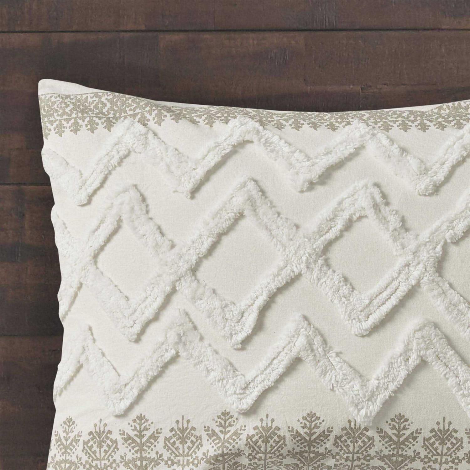 Transform you bedroom with the charming shabby chic allure of the INKIVY Mila 3 Piece Cotton Comforter Set with Chenille Tufting. The cotton comforter flaunts an updated taupe botanic print, on a natural white ground, with tufted white chenille, in a chevron design, to create a charming farmhouse look. A solid taupe reverse complements the top of the comforter, while hidden bartacking secures the hypoallergenic polyester filling without visible line for a clean finish. Two matching shams beautifully mimic the design of the comforter, completing the farmhouse comforter set. Machine washable, this cotton tufted comforter set offers soft comfort and a vivid touch that elevates your bedroom decor. This comforter is OEKOTEX certified, meaning it does not contain any harmful substances or chemicals to ensure quality comfort and wellness.