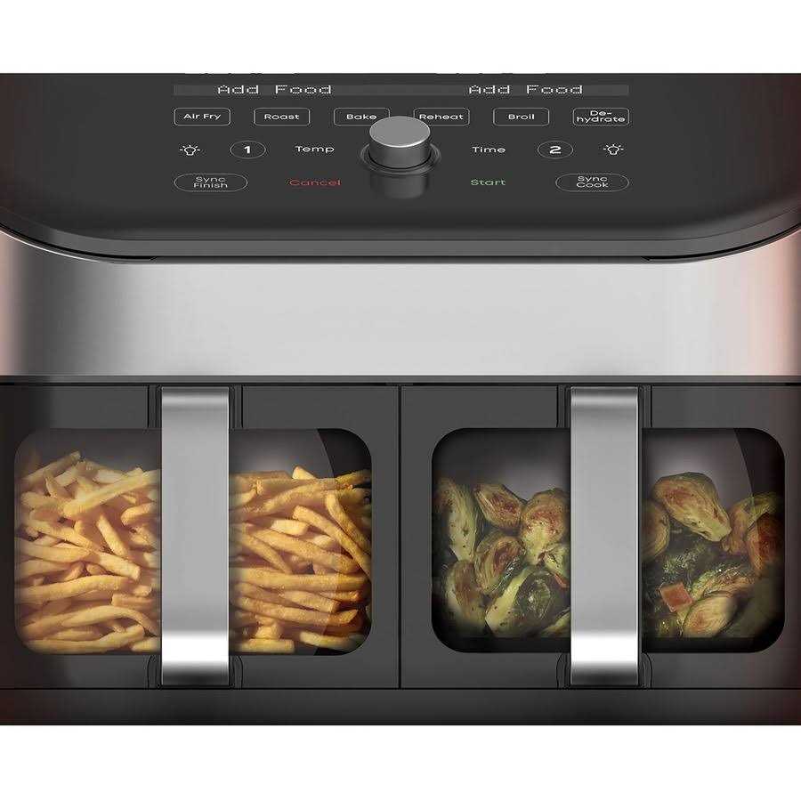 When one air fryer just isn’t enough, try two. This innovative appliance is equipped with two independently controlled airfry baskets and convenient ClearView windows that allow you to watch the cooking progress of your food. It also boasts eight cooking modes, including airfry, roast, broil, bake, reheat and dehydrate. SyncCook mode allows you to cook two portions of the same food on the same program while SyncFinish mode ensures different programs finish cooking at the same time. Designed to transform the functionality of your kitchen, the multitasking machine features a generous capacity for family meals, easy-to-use touchscreen controls and dishwasher-safe parts. Dual airfry baskets have separate controls for individual programs. 8-in-1 machine features airfry, roast, broil, bake, reheat, dehydrate, SyncCook and SyncFinish functions. SyncCook lets you cook double the amount of food by placing the same ingredients in each basket on the same program. SyncFinish automatically synchronizes cooking time of two different programs so food is ready at the same time. 8 customizable one-touch programs include chicken wings, roasted veggies and cinnamon buns. ClearView windows and interior lights allow you to monitor cooking progress without opening baskets. EvenCrisp technology produces deep-fried, crunchy-on-the-outside and tender-on-the-inside texture with 95% less oil. Temperature adjusts from 95deg.F-400deg.F. Easy-to-use touchscreen displays step-by-step instructions while cooking. Comes with 2 airfry baskets and 2 cooking racks. Airfry baskets and cooking racks are dishwasher safe.