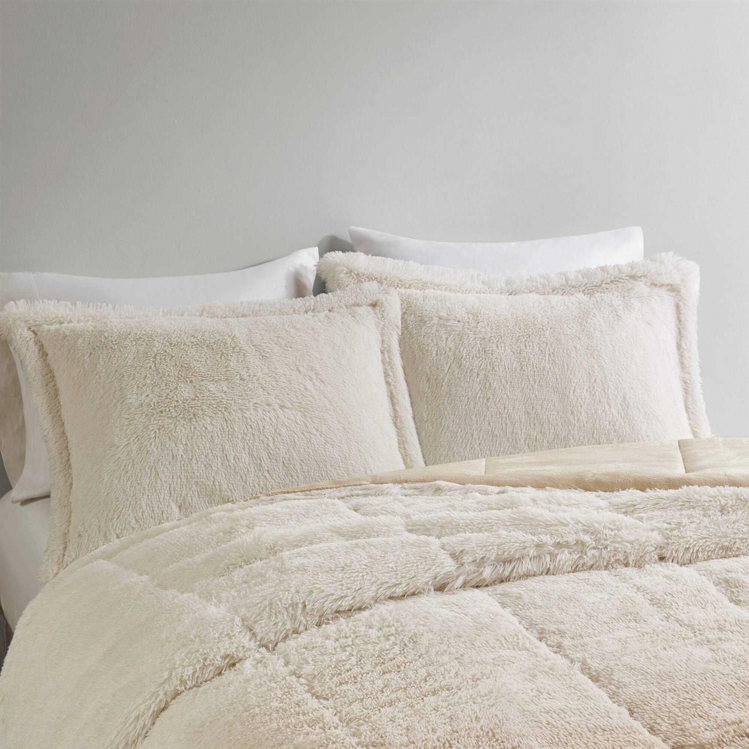 This shaggy fur comforter features an ombre design with a soft, warm faux mink reverse, bringing you ultimate warmth and comfort. The set includes matching shams that coordinate with the comforter. The hypoallergenic polyester filling in the comforter contains no allergens and is treated to be dustproof. Machine washable for easy care, this faux fur comforter cradles you in lush comfort.