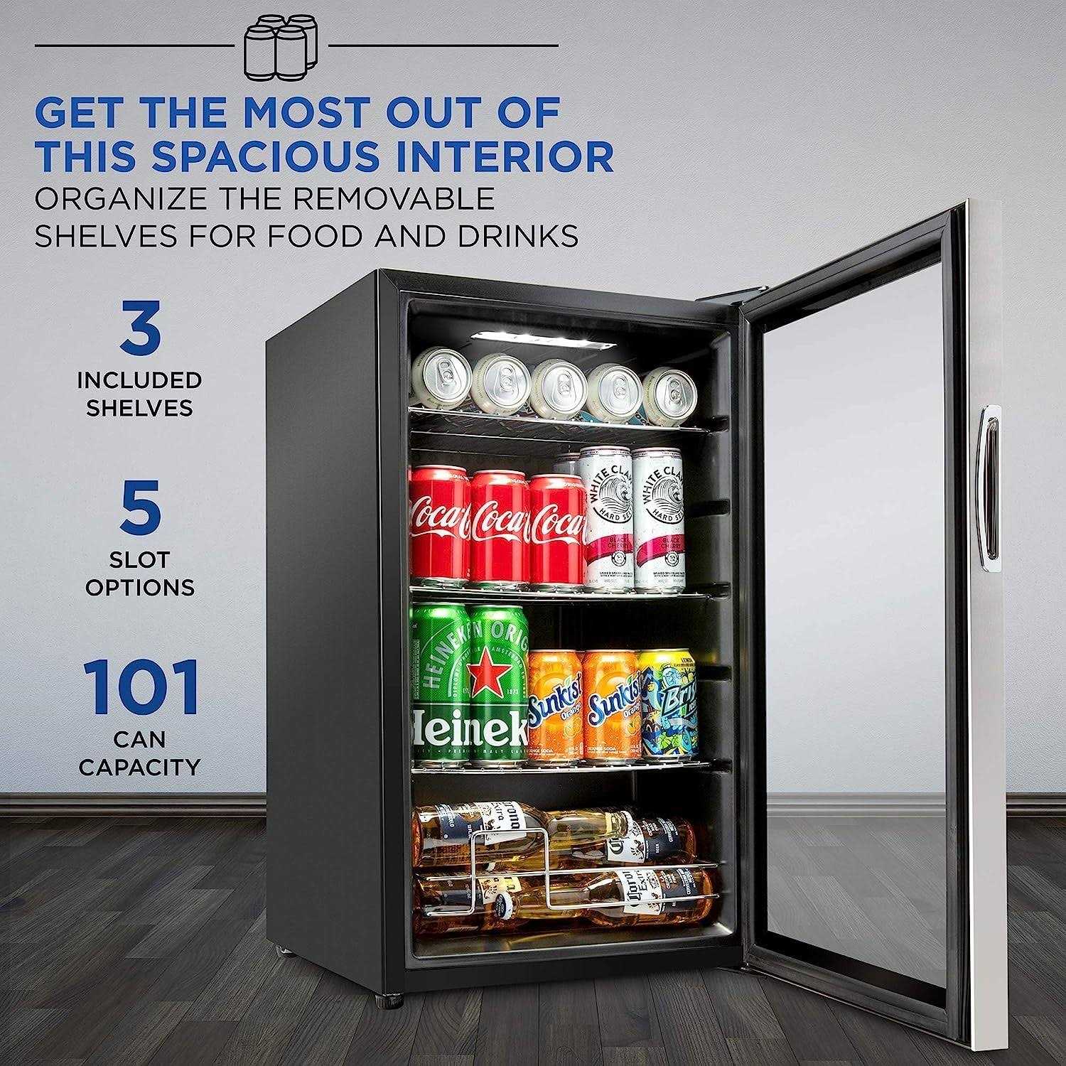 Keep cool with your favorite beverages Stock up on cold, refreshing beverages with the Ivation 126 Can Beverage Refrigerator with Adjustable Temperature Settings in Stainless Steel Silver. Place this cooling unit in any room where you can sit back and quickly open up a fresh can of beer or soda. Enjoy having a mini refrigerator near you when youre having a barbeque or watching a sports game. Never go thirsty when you have a personal cooler that holds up to 126 cans. With its quiet and energy efficient operation, you wont be distracted having it next to you. Watch your beverages in display chill right before your eyes with the interior LED lighting and the transparent, reversible glass door. Sit back and chill out knowing that your drinks are effectively chilling, too.