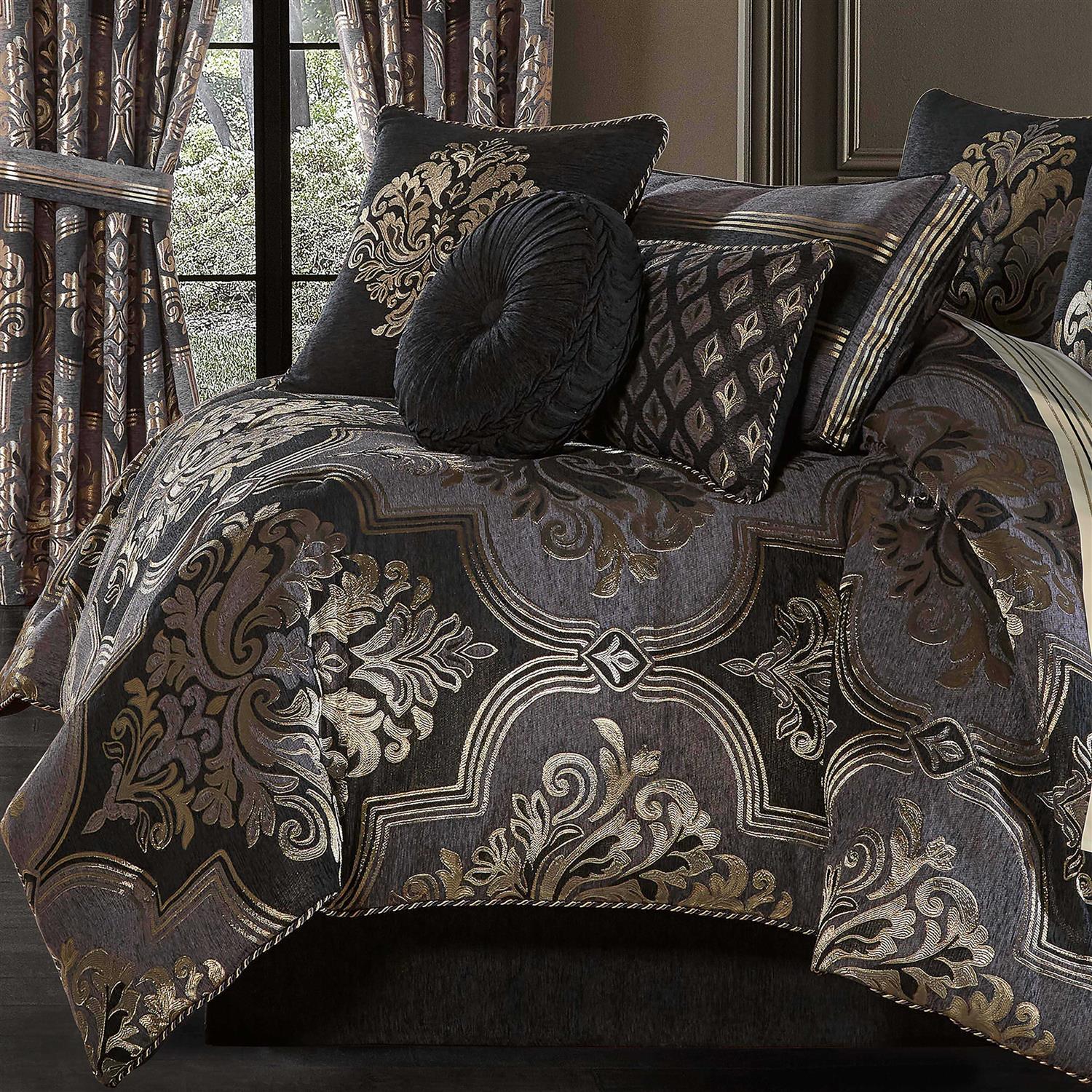 The Sayreville 4 Piece Comforter Set is a showstopper, that will add elegance, glamour and luxury to your bedroom decor. Tones of black, pewter and gold are combined in this dramatic, grand scale chenille damask ensemble. The ornate framed gold and pewter woven damask is accented with a black solid chenille background to create an eye-catching atmosphere. This stunning oversized and overfilled comforter is truly one that will give you lasting comfort and an array of compliments. Paired with matching shams and a split-corner tailored bedskirt that pulls the beauty all together. Pair this bedding collection with the Sayreville throw pillows, shams, and window treatments for a complete look.