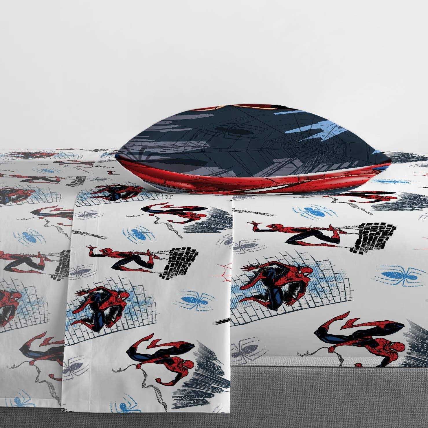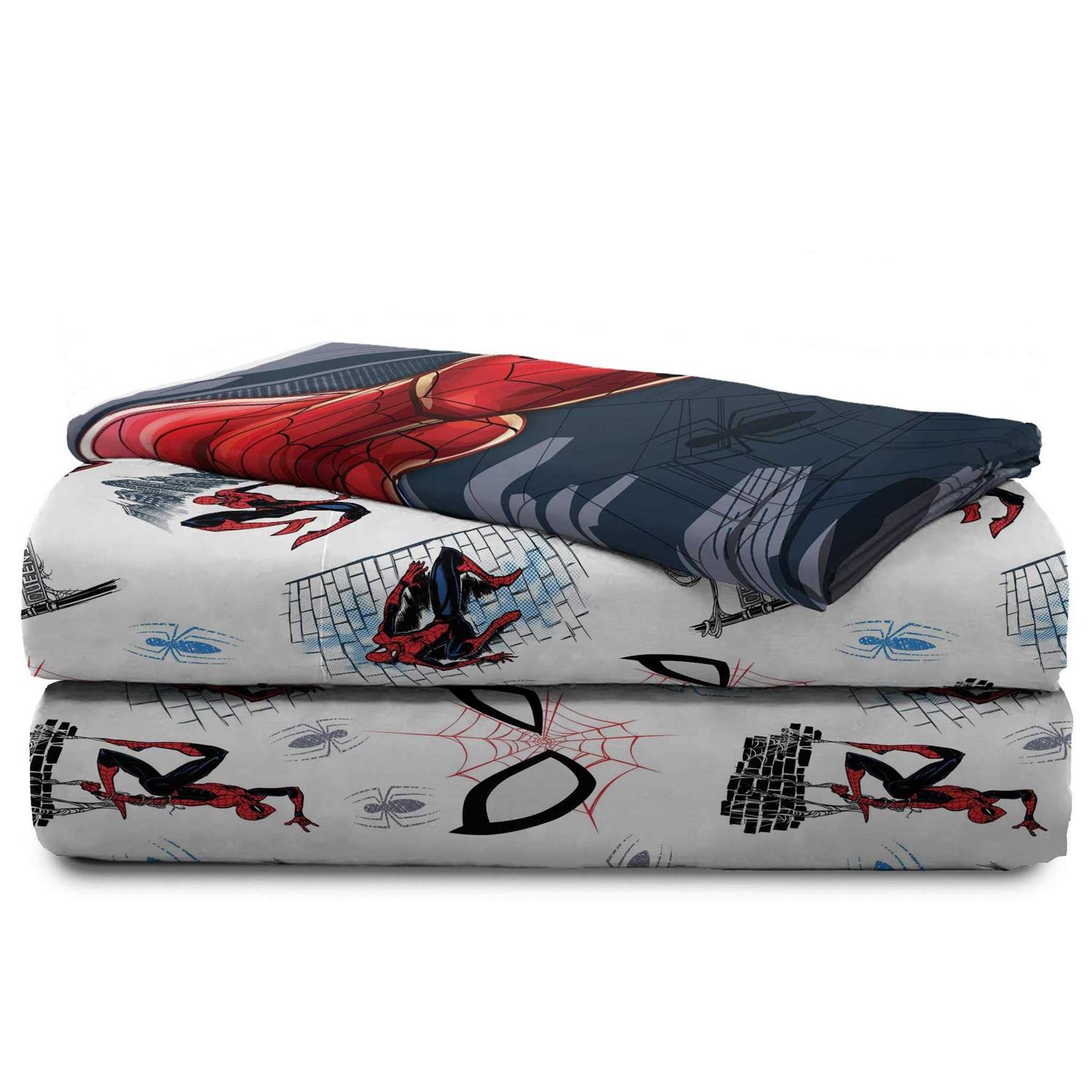 Need a quick room makeover for your Super Hero Fan This Spider-Man Bed in a Bag is a great start Everything you need to change the entire look of your bedroom. The Bed in a Bag includes One twin comforter One flat sheet one fitted sheet and one pillowcase. The face of the comforter features Spider-Man crawling up a building the reverse features a repeat pattern. The sheets have a white background and feature Spider-Man in action as well as a spider web with his eyes. The Pillowcase is reversible featuring two different looks of Spider-Man.