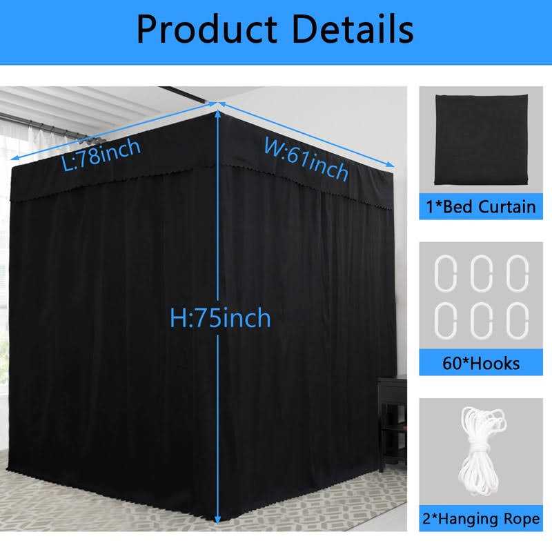 Features: Our black canopy bed curtains is made of High Quality microfiber polyester which is soft, durable and washable, will be a hit for your room. This bed canopy curtains is windproof and lightproof, which will bring you a quite and nice sleeping environment for all seasons. 3 opening doors design of queen bed curtains canopy provide you a three dimensional space of comfort without annoying. Black canopy bed curtains can be used for many times. Machine washable or hand wash with cool water and a gentle detergent. Do not use bleach. Stylish and beautiful, perfect gift for your girls, and women, the curtains queen bed canopy will make your rooms looks romantic, stylish and beautiful. Easy to install: 1. Find the 4 corners of the bed canopy; 2. Put the bed canopy curtains on the frame. Attention: 1. Keep the canopy bed curtains away from sharp objects. 2. All dimensions of bed canopy are measured manually, please allow slight error. 3. There may be some color difference due to different computer monitor. Hope you can understand! Package Include: 1 x Black Canopy Bed Curtains+60 x Hooks+ 2 x Ropes(Not include frame/post/bracket) Queen Bed Size: 61″Wx78″Lx75″H