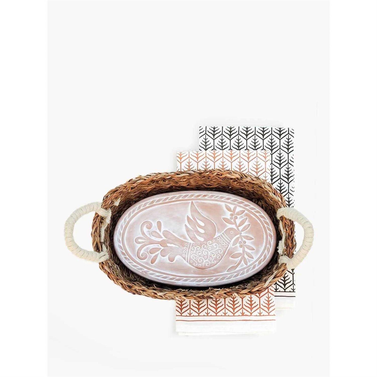 Add a bit of artisan-inspired style to the kitchen with a terracotta bread warmer and hand screen printed tea towel. Engraved with a bird &and leaf design and cut to fit neatly into an oval basket, this terracotta special bread warmer is naturally insulating, and the basket itself has been handwoven from sustainably grown seagrass. The tea towel is great for drying dishes or hands in the kitchen, lining a bread basket. They are the best gift items for anyone who loves bread! Included items, (1) Terracotta Bread warmer, (1) Seagrass basket and (1) Tea towel of your choice. Each product is sustainably handmade by Fair Trade artisans in Bangladesh.