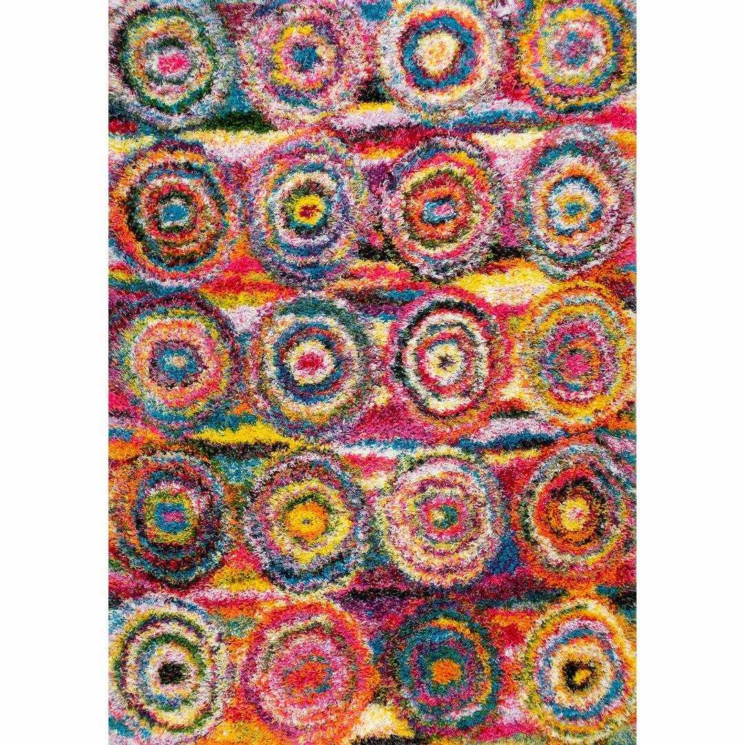Latitude Run Brighten your room with this distinctively vivid shag rug. The plush pile is sure to add warmth to your space and comfort under your feet. The abstract circle design will make a statement in any room. Machine made in Turkey, this rug is built to last.