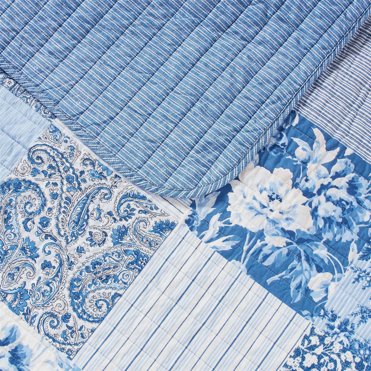 The patchwork features a combination of floral, stripes and paisley print for an overall modern take on a traditional design. The quilt reverses to a vertical white stripe on a blue ground that also binds the quilt.