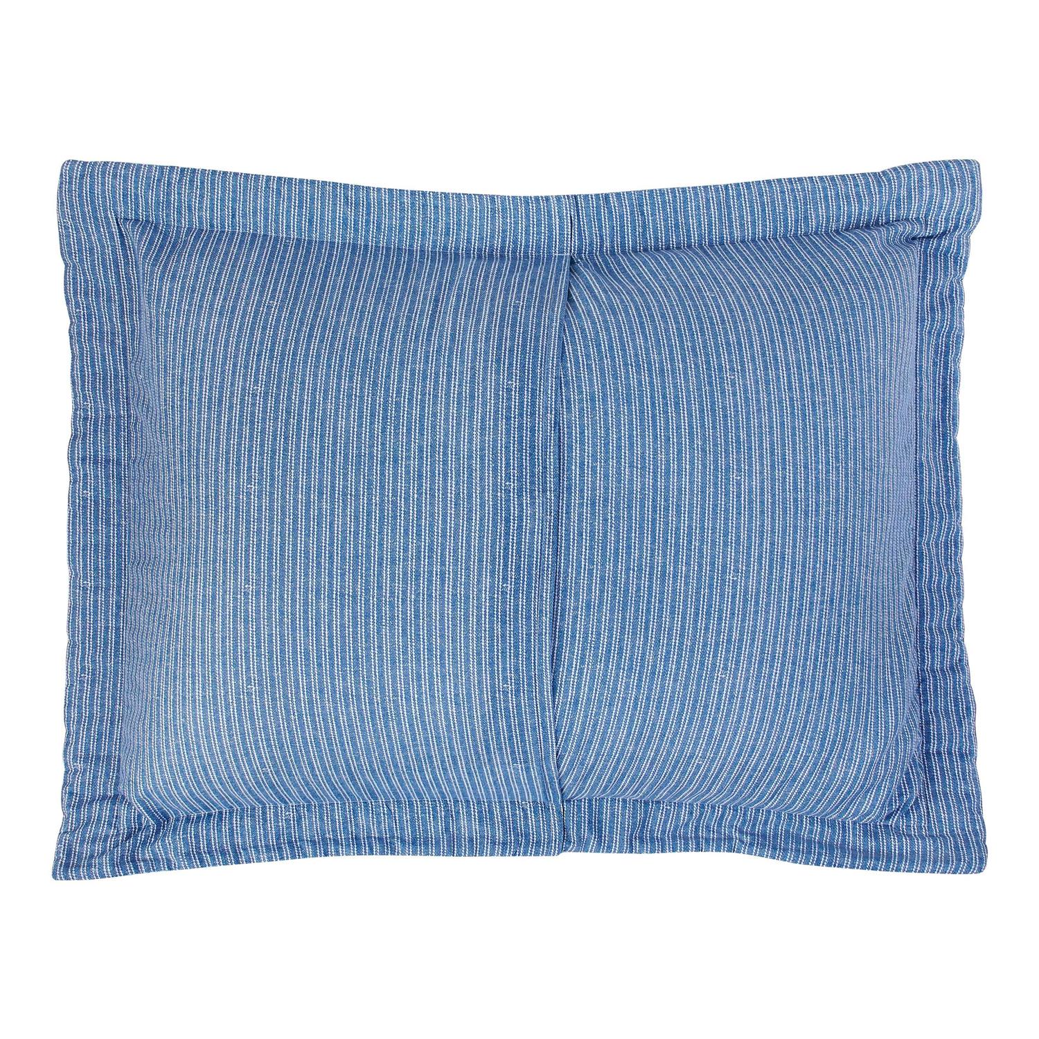 The patchwork features a combination of floral, stripes and paisley print for an overall modern take on a traditional design. The quilt reverses to a vertical white stripe on a blue ground that also binds the quilt.