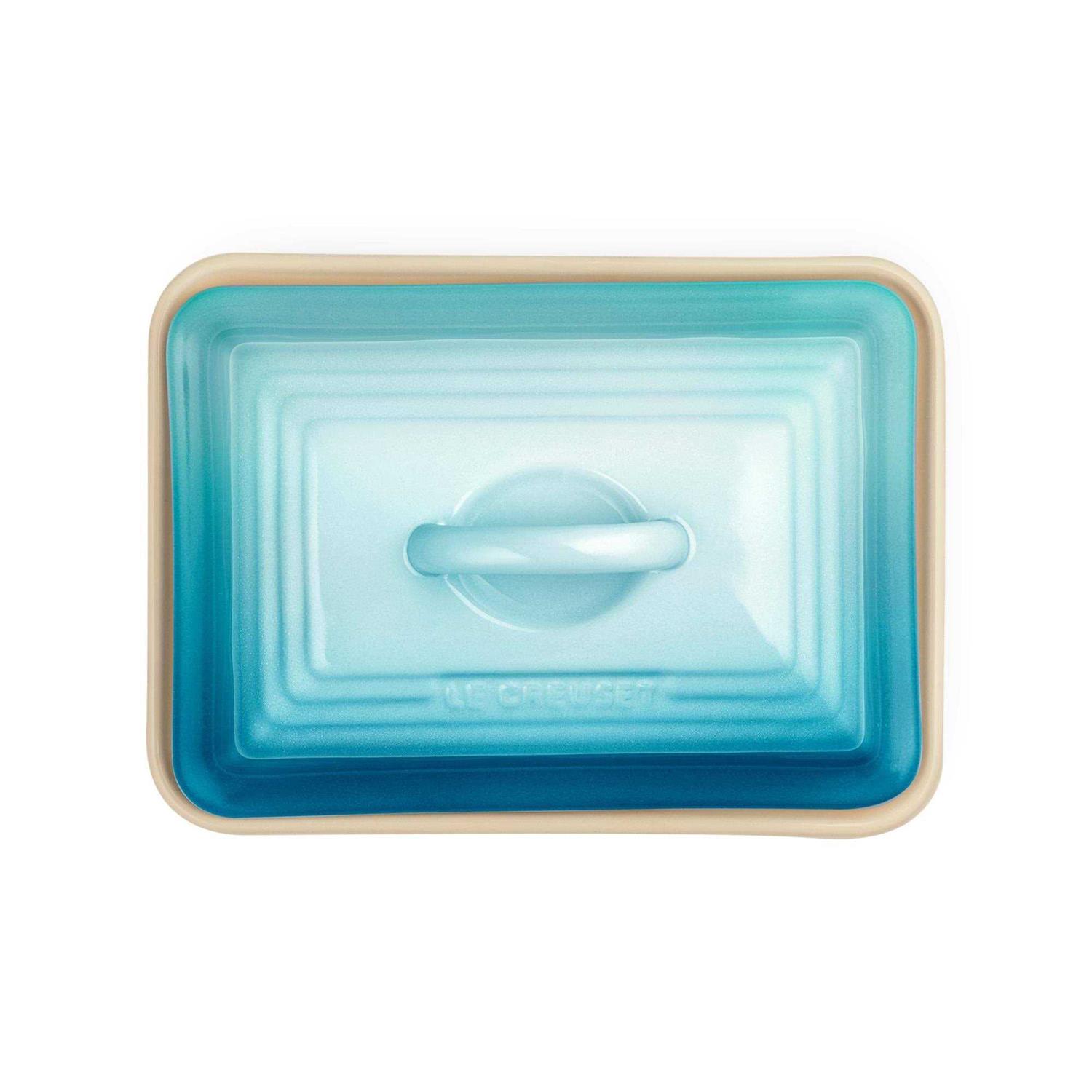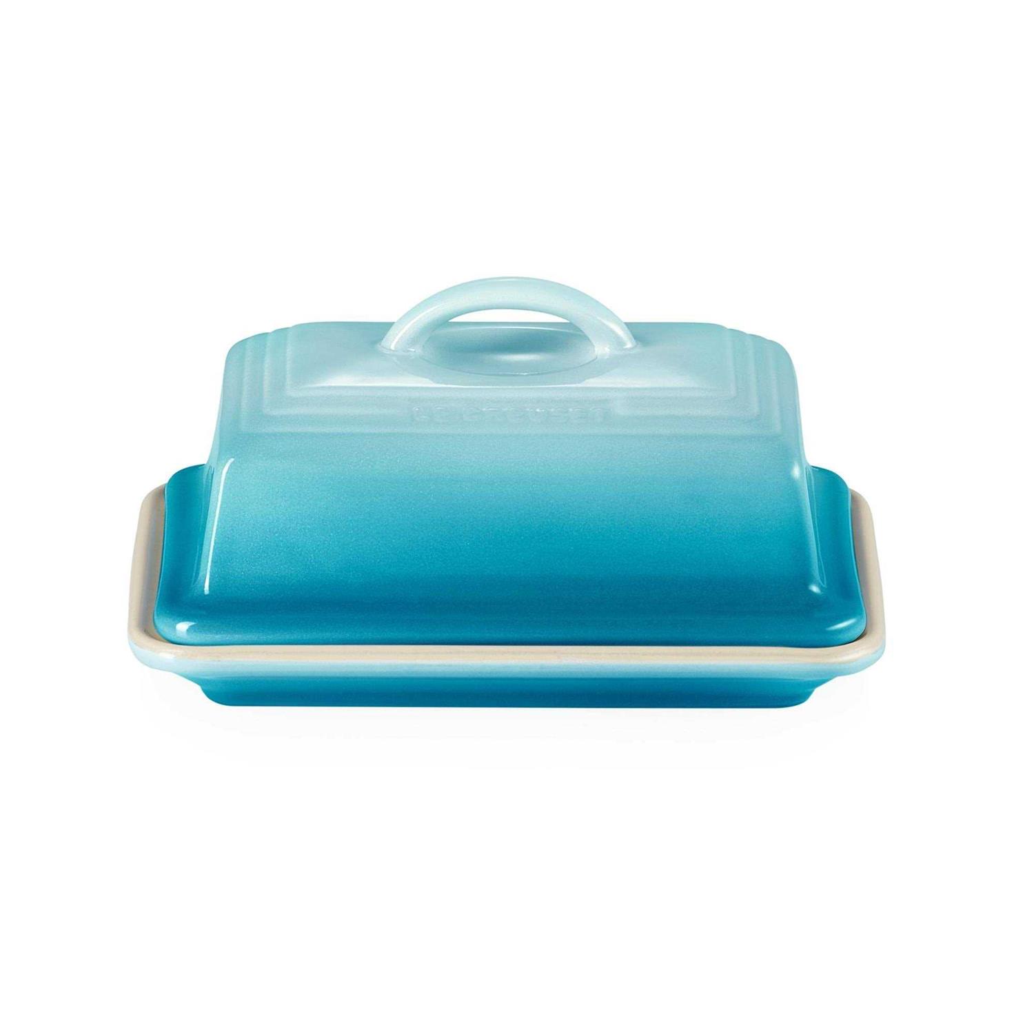 This extra-large dish can hold two sticks of butter. The dense stoneware blocks moisture absorption and is safe for the dishwasher. The glazed surface cleans up easily, and resists chips, scratches, and stains.The calming hue of Caribbean evokes the warmth of the islands and helps you create a serene atmosphere while cooking and dining. Le Creuset recommends Marseille and White as complementary colors for expanding your collection.Holds two sticks of butter5 x 6.75 inchesDishwasher safe.