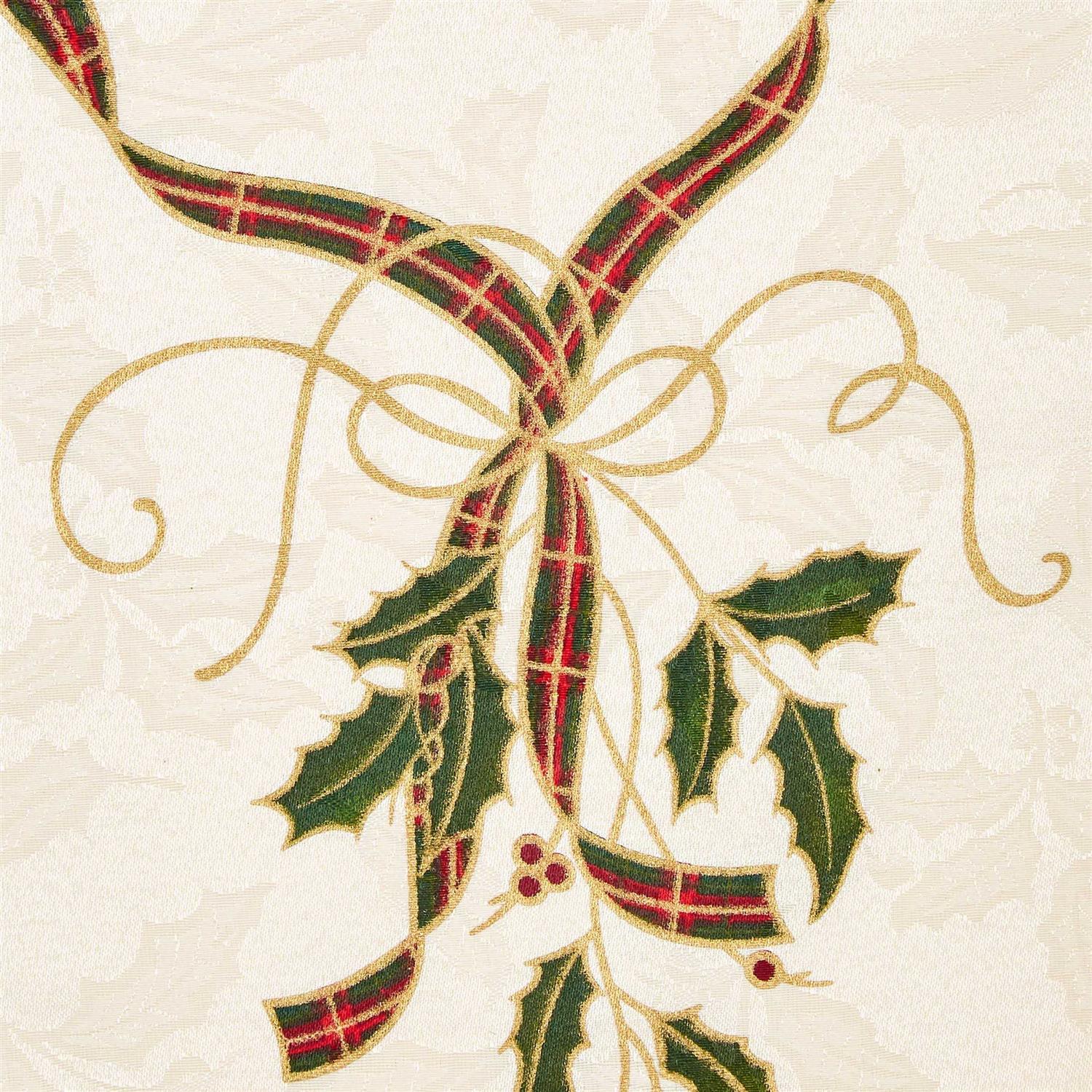 The Lenox Holiday Nouveau table linen collection offers traditional holiday motifs of green holly, swirling plaid ribbons and golden bows. A magnificent red and green tartan plaid border adorns the collections engineered print tablecloth. Over printed on an ivory holly leaf pattern woven damask fabric. A festive addition to your holiday decor you’ll use year after year.