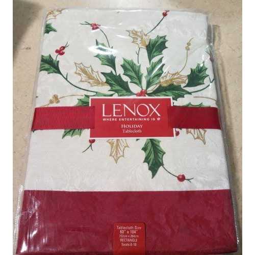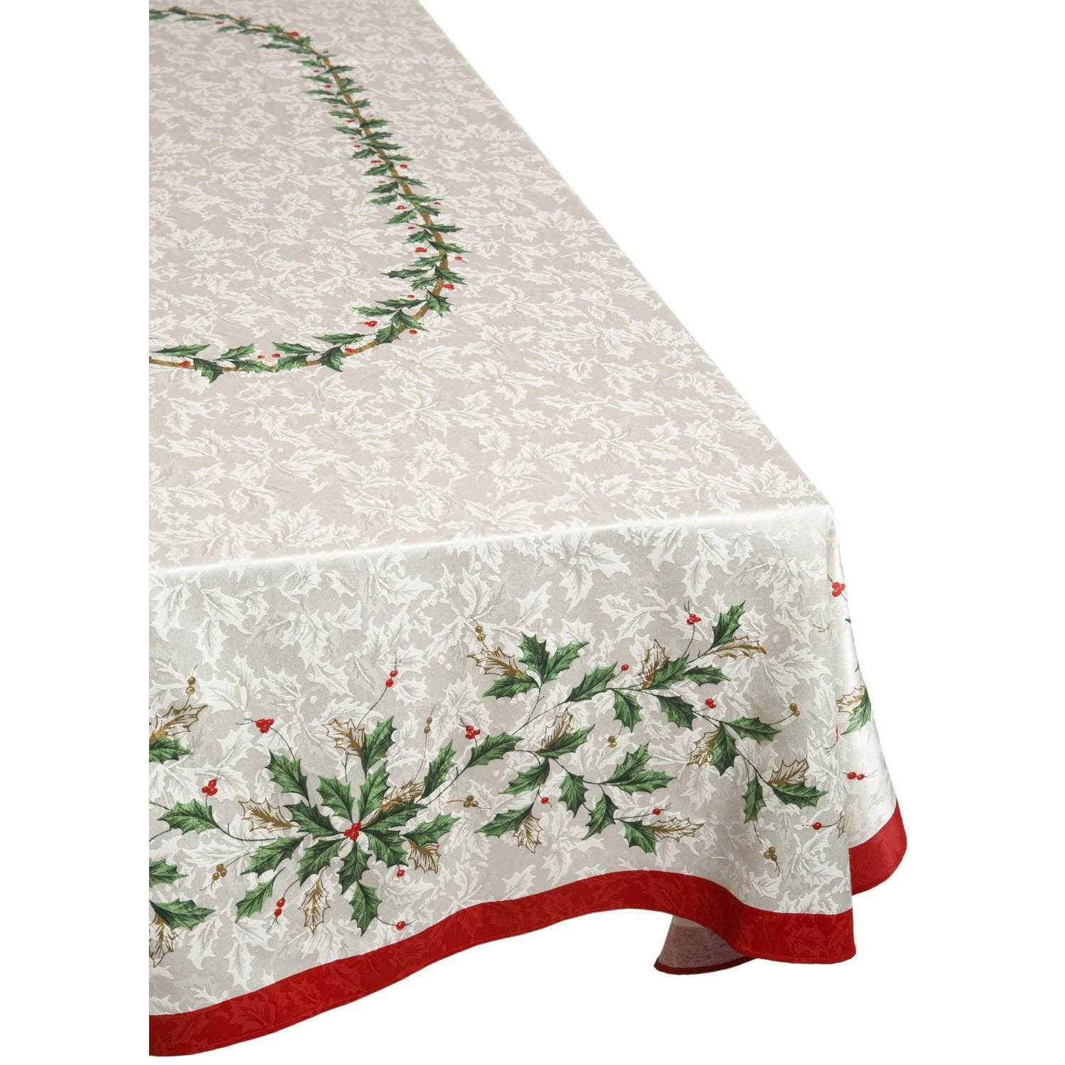 Celebrate the magic of the holiday season with the Holiday Holly Tablecloth from Lenox. Beautiful holly branches in green, red, and gold decorate a neutral toned backdrop and are punctuated by a red border. Machine washable.