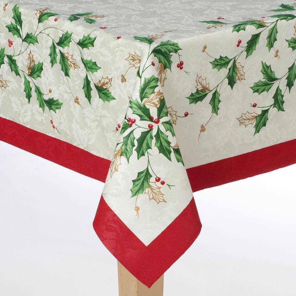 Celebrate the magic of the holiday season with the Holiday Holly Tablecloth from Lenox. Beautiful holly branches in green, red, and gold decorate a neutral toned backdrop and are punctuated by a red border. Machine washable.