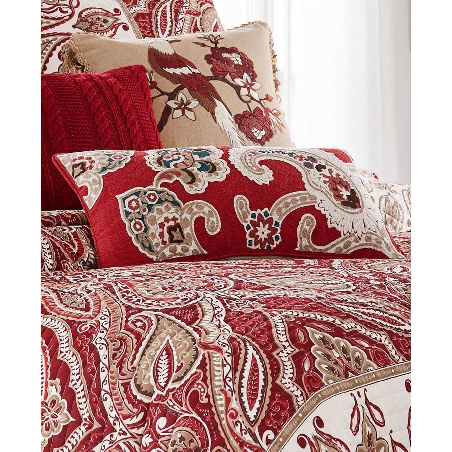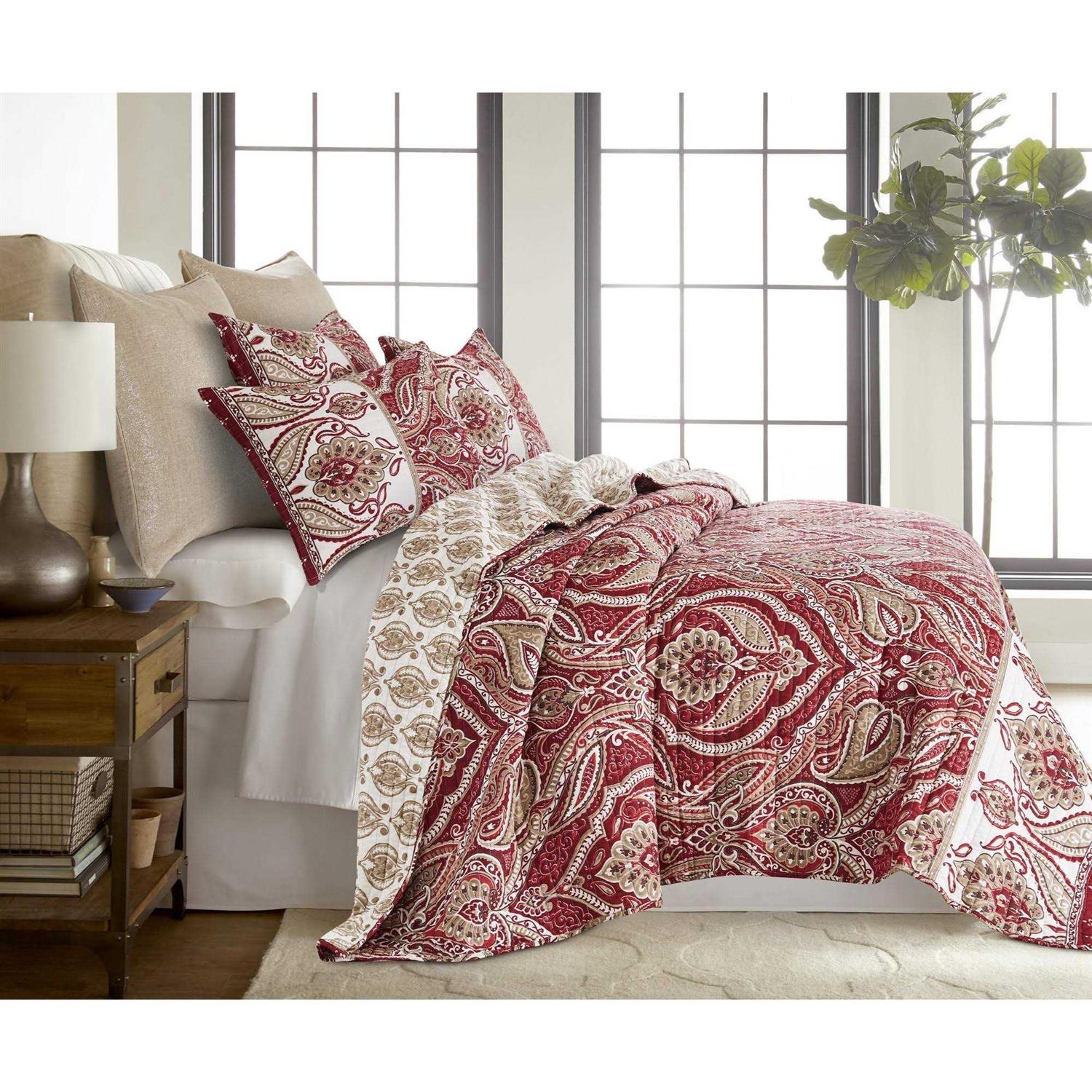The Astrid Reversible Full/Queen Quilt by Villa Lugano for Levtex Home is inspired by antique wall coverings and tapestries. Offered in classic red and taupe, this design will immediately transform your bedroom. This reversible quilt features a rich collection of medallions and paisleys offset with a distinctive bottom border on the front, reversing to a small red and taupe medallion on white on the back. The Full/Queen Quilt (88x92in.) is filled with a cotton rich filler and is machine washable. Enjoy this for years to come!