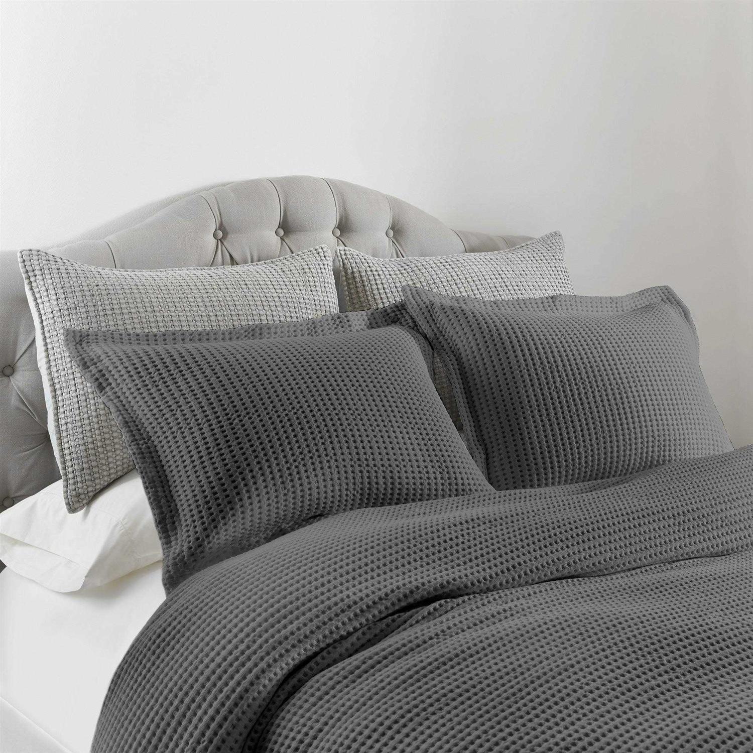 The Mills Waffle Duvet Cover Set by Levtex Home is hip and contemporary. Offered in different colors, this design will immediately transform your bedroom. Made with a durable cotton, this duvet cover set features a waffle pattern. It has a bright white waffle on the front and a 100percent cotton solid on the reverse. It closes with easy to use, durable buttons. The Mills Waffle Duvet Cover Set is machine washable and includes the duvet and pillow shams. Enjoy this for years to come!