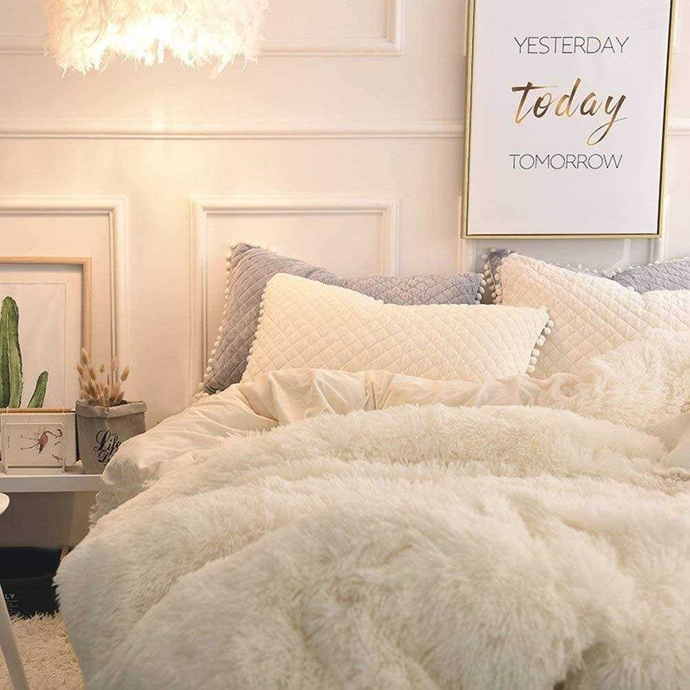 LIFEREVO Luxury Plush Shaggy Duvet Cover Set 1 Faux Fur Duvet Cover + 2 Pompoms