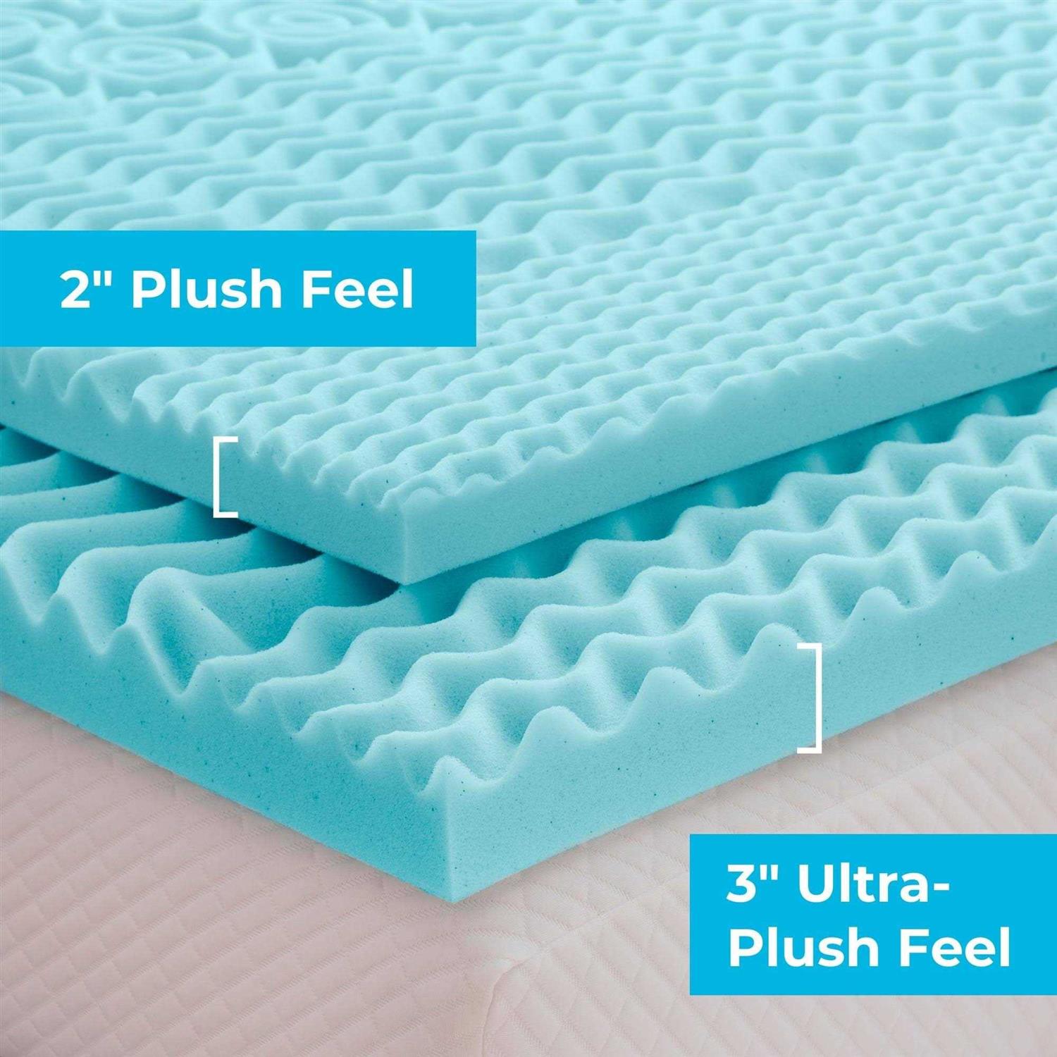 Transform your hard mattress into a delightfully comfortable bed instantly. Our enhanced memory foam formula has seven different comfort zones that work together to relieve pain at the neck, back, hips, knees, and ankles while AlwaysCool infusions with gel help maintain a comfortable sleep temperature. Incredibly soft ActiveRelief memory foam hugs your body to properly align the spine, which enhances comfort and decreases your chance of waking up with stiff joints or sore muscles. This innovative topper will prolong the life of your mattress, turn a hard mattress into a comfortable bed, and change the way you sleep instantly. Plus, the same amazing zoned technology is available in a plush two-inch profile or an even plusher three-inch profile. With new technologies to enhance and protect your sleep, Essentials is here to make sure comfort is always a top priority. Remove from packaging within 72 hours to maximize expansion. You can sleep on it the same night it is unwrapped, however allow 48 hours to fully return to its original shape. Vacuum sealing sometimes traps odors. After unwrapping, air for a few hours to eliminate trapped odors. Due to machine-cutting manufacturing processes, there may be slight variances in the dimensions of this product. Due to the nature of memory foam, the firmness level of similar products may produce different firmness results.
