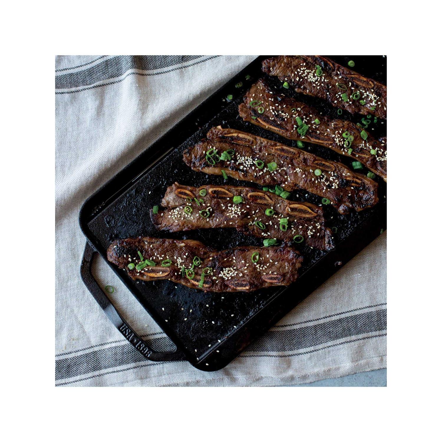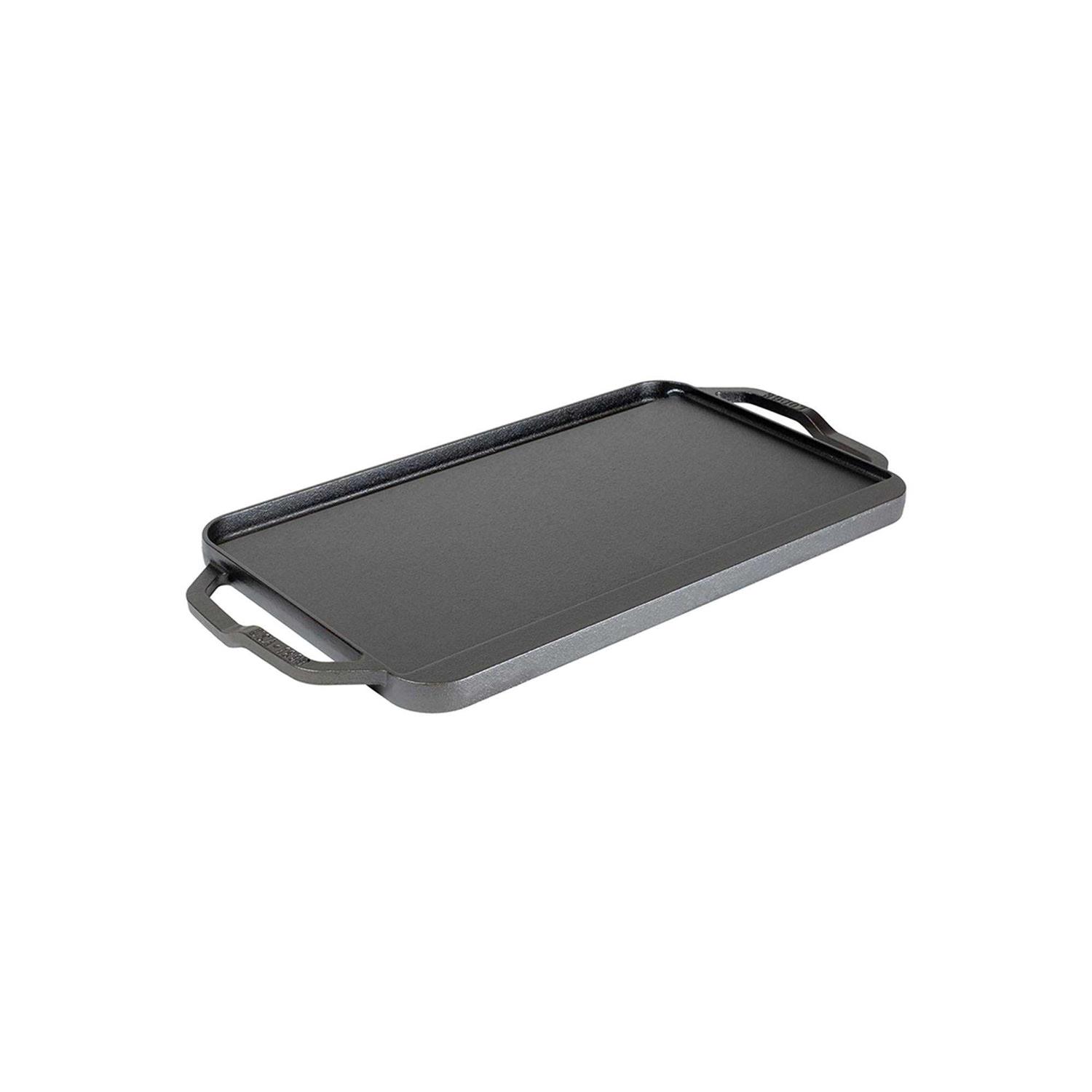 Boasting a chef-inspired, spatula-friendly design, Lodge’s reversible cast-iron pan is really two pans in one – a flat griddle for morning favorites like eggs, pancakes and sausage, and a ridged grill for sizzling-hot meat, seafood and vegetables. Preseasoned and ready to use, the double-burner pan has ergonomic handles and a drip-catching well on each side. Reversible grill/griddle pan fits over two stovetop burners. Heavyweight cast iron transfers and retains heat evenly. Preseasoned for smooth finish that resists sticking and rust. Lifted handles offer ergonomic grip and superior control for both grill and griddle. Each side features drip tray to catch liquid. Low rims make it easy to turn food. Made in USA by Lodge, America’s oldest family-owned cookware foundry. Ideal for use on any type of cooktop, including induction.