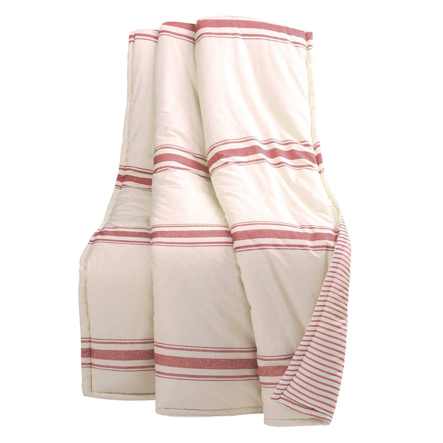 The printing on the front is reminiscent of shiplap beams with colored stripes spaced far apart on the white cotton material. This is a reversible throw with the polyester back featuring a pinstripe print in a matching color. This blanket makes a welcome decorative accent for placing across the back of a chair or sofa or draping across the foot of a bed. The soft cotton throw can also be used as the main blanket on a child’s bed. It has a 460 thread count for a luxuriant texture and is machine washable for easy and convenient cleaning and care. This Lush Decor throw also coordinates with and complements the other pieces in the Farmhouse collection which are available separately for a uniform motif.