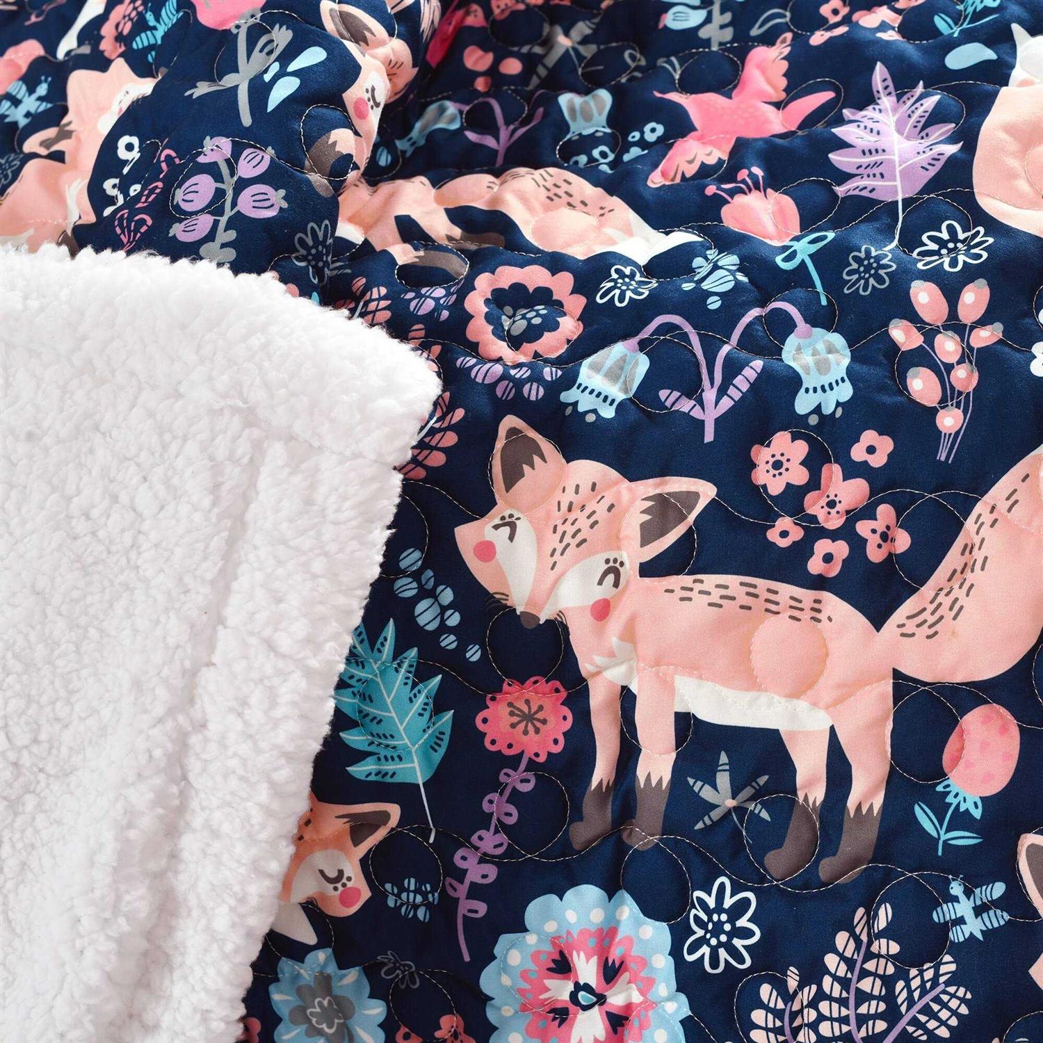 Soft, 100% microfiber fabric reversible sherpa throw measures 60 x 50 and contains a cotton/poly blend filling. A perfect fuzzy fox blanket for the living room, foot of the bed, nursery, crate blanket or as a gift. Decorative, whimsical purple and pink design set against a white background for a beautiful, functional throw. Decorative, whimsical gray and pink design set against a white background for a beautiful, functional throw.