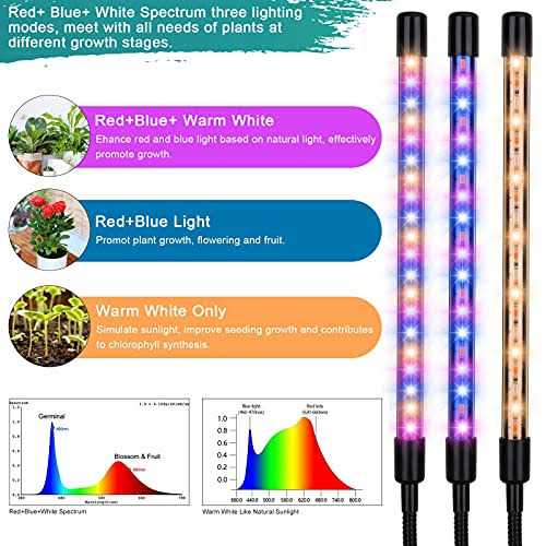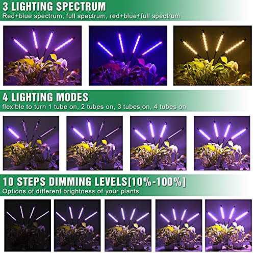 Quality Grow Light with Stand: stable, durable tripod stand, can be adjusted from 15” to 60”, with 360 degree flexible gooseneck, compared with clip grow light and hanging grow light, our stand one is flexible to adjust and setup according to your different needs, provide a much wider coverage for indoor plants Comprehensive and Effective Spectrum: this 4-head grow light contains 3 supplemental light modes:1. warm white(3000k), similar to sunlight, simulate nature environment for plants; 2. Red(660nm)+Blue(460nm): promote photosynthesis, rooting, germination, blooming, fruiting; 3. Red+Blue+White(380nm-780nm), provide universal full spectrum which can meet different needs of all plant growth Double Control and Auto On/Off Timer Function: equipped with line-in controller and RF controller, remote control is more convenient to operate and protect your eyes. Designed with auto circular memory timing function, 4/8/12H modes for you to choose, the plant light will turn it on by itself everyday as your setting, solve the problem of usage when nobody at home 10 Level Brightness and Perfect Heat Dissipation: our plant grow light has 10 brightness setting ranging from 10% to 100%, you can randomly switch it to find the most suitable brightness for your plant growth, helps your plants grow 5 times faster and more flourish than natural; Scientific heat dissipation system equipped as well, will protect grow lamp bulbs not very hot as traditional one, reduce light loss and extend life to more than 50000 hours Widely applications: our plant grow light with stand are mainly designed for indoor plants, suitable for balconies,greenhouses,darkroom,office and so on, especially when the plant needs extra light when raining,snowing,dark indoor,etc.
