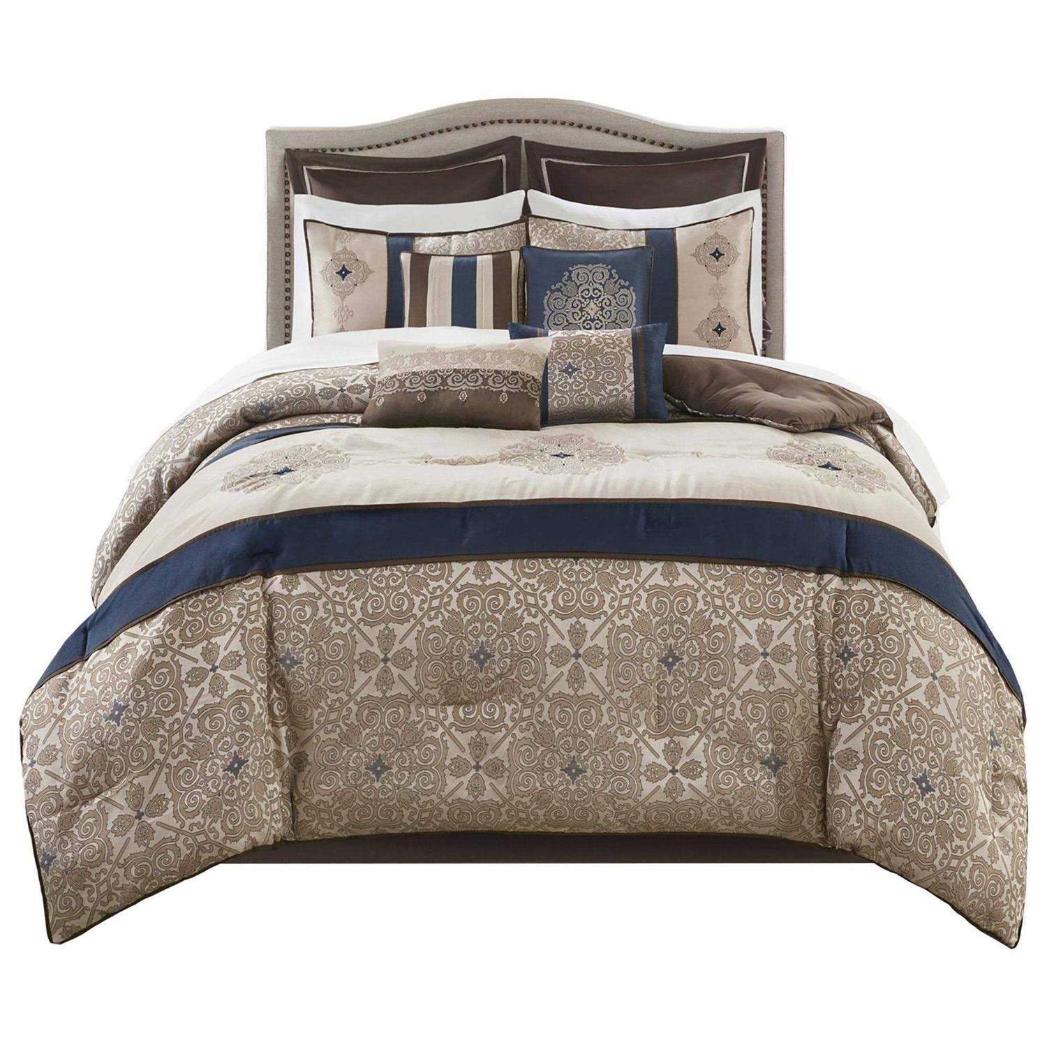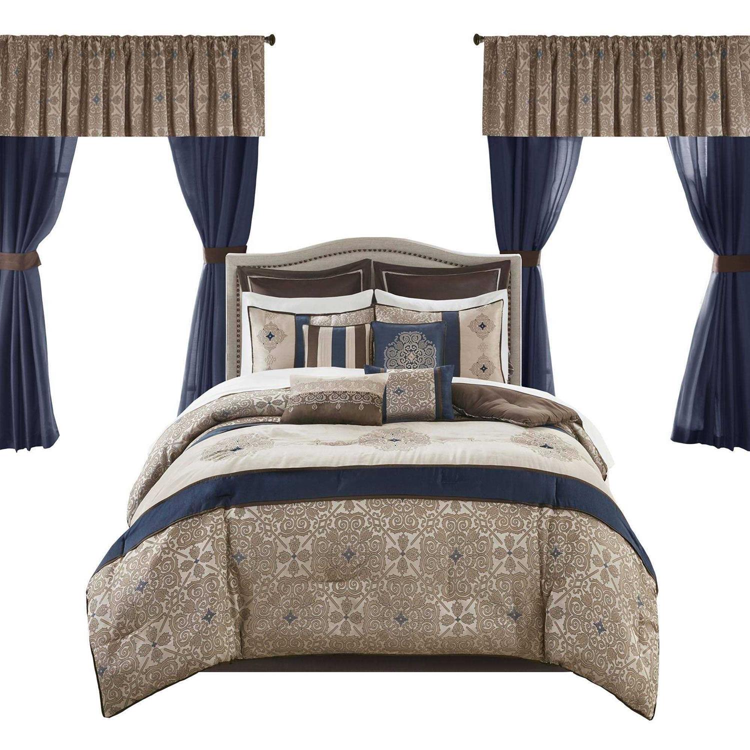 Open-Box — The Madison Park Essentials Delaney 24 Piece Room in a Bag offers a refined traditional update to your bedroom decor. The jacquard details flaunted on the pieced faux silk comforter, shams, and window valances deliver an elegant statement, in rich navy and natural hues. Large medallion embroidery is displayed off-center on the luxurious comforter, adding charm and dimension to the bedding set, while matching shams echo the motif seen on top of the bed to create an elegant look in your space. An included microfiber sheet set and bed skirt complements the bedding collection and offers exceptional comfort and style. Two Euro shams and four decorative pillows help to complete the bedding set, giving it a finished look. Accompanying this bedroom set are four window panels with four tie backs to keep curtains drawn open, while two jacquard valances provide the finishing touches to your bedroom.