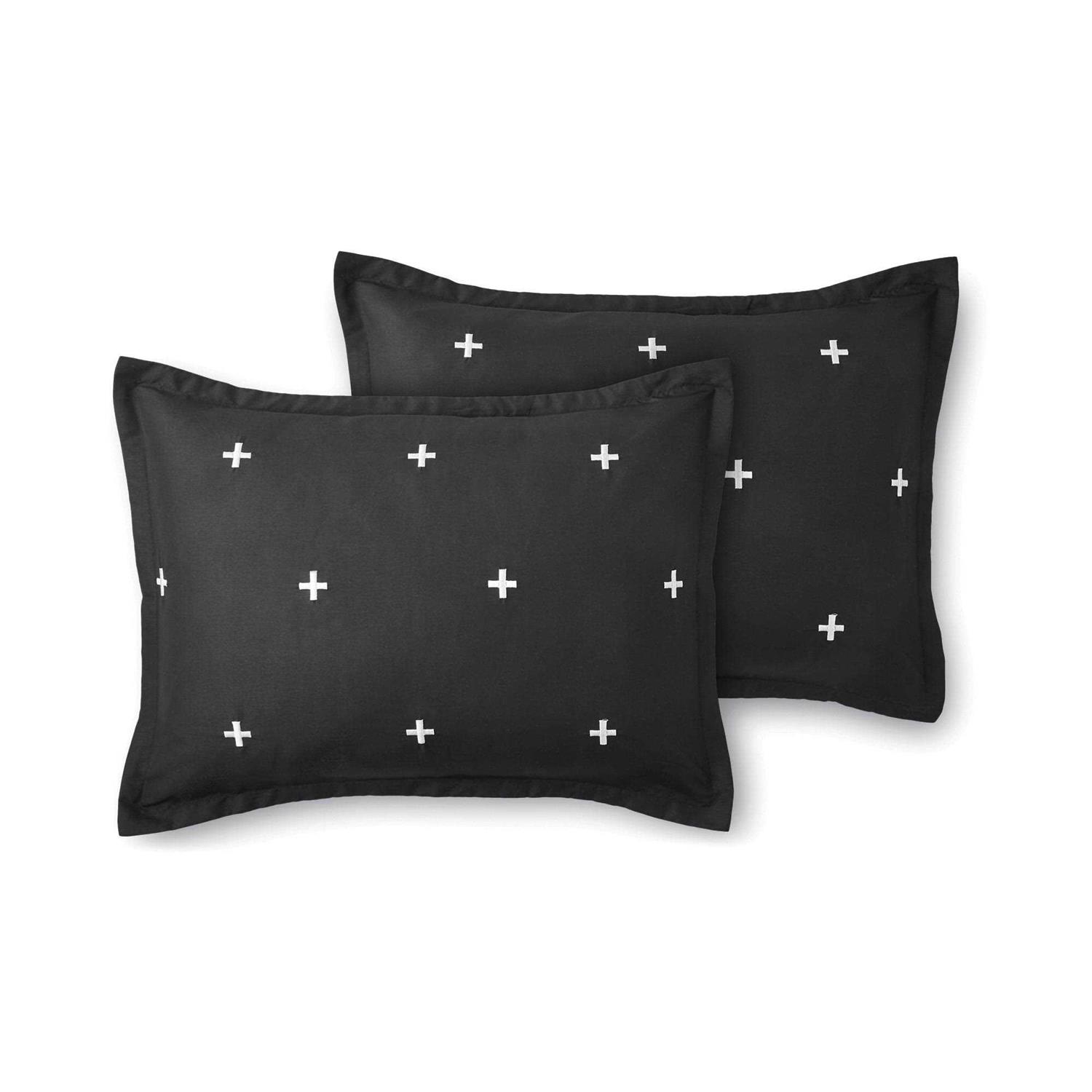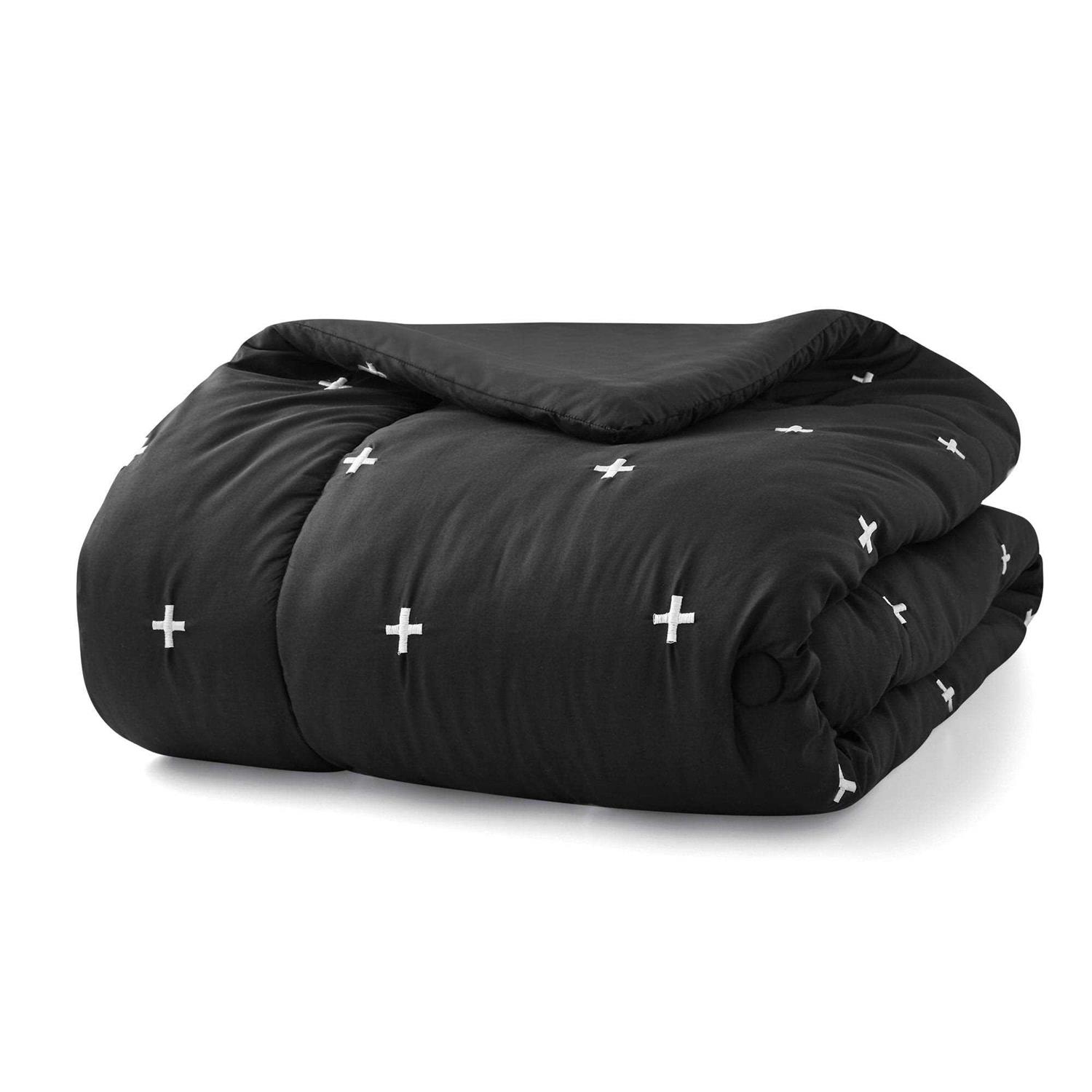 Bring a modern flair to the bedroom with the Mainstays Embroidered Cross 7 Piece Comforter Bedding Set. The microfiber comforter and shams flaunt mini embroidered white swiss crosses on a black background. Three decorative pillows with embroidered details, long faux fur and/or embroidered flange and tassels coordinate beautifully with the top of the bed, while the solid black bed skirt with a 14-inch drop provides a clean finish. Stunning and soft, this embroidered swiss cross comforter set is machine washable for easy care.