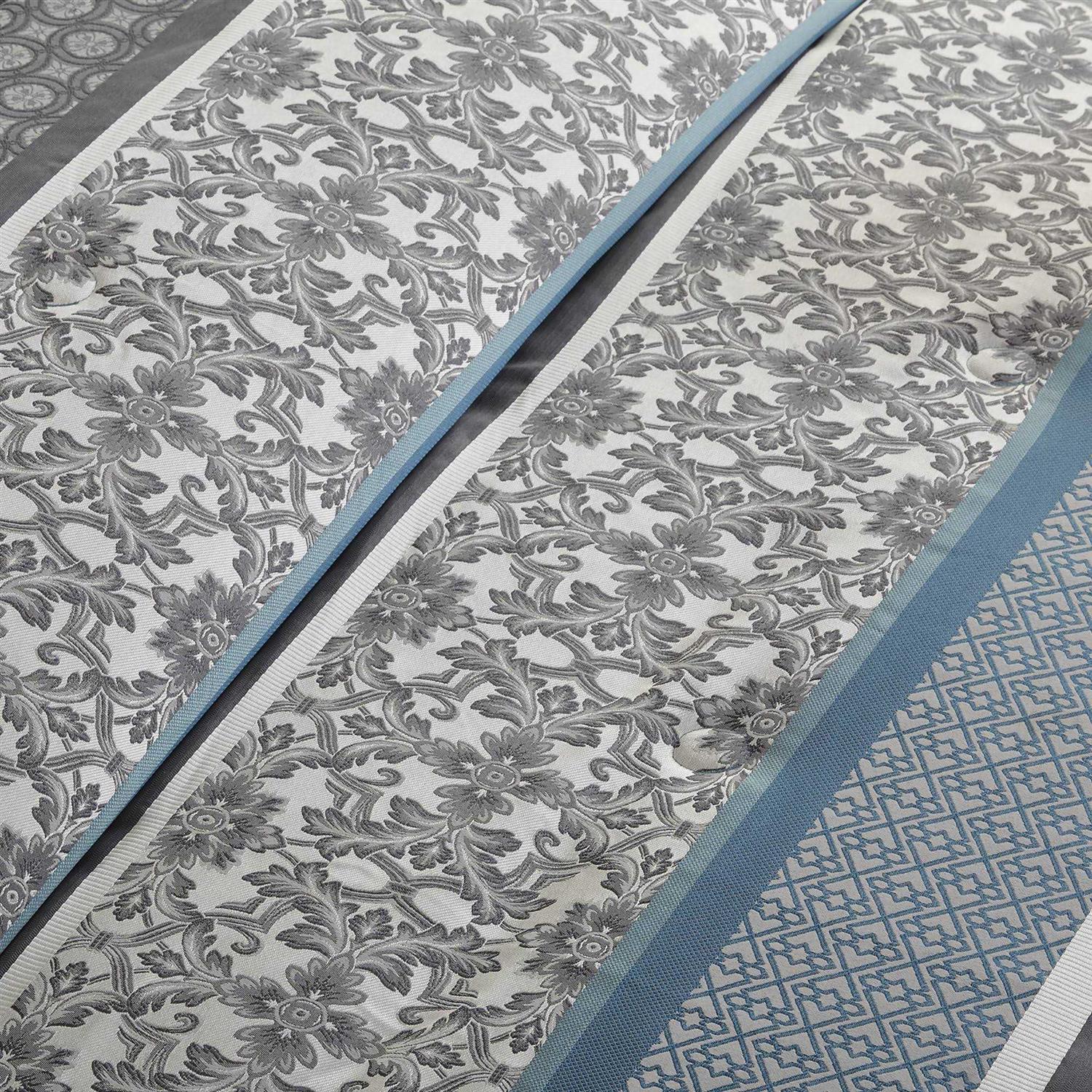 Brighten your bedroom with the Mainstays Princeton Stripe 7 Piece Comforter Bedding Set. The polyester jacquard comforter and matching shams feature a striped design with various geometric and solid patterns to create beautifully chic look. The solid reverse coordinates with the 14-inch drop solid bed skirt while three decorative pillows with embroidered details add the finishing touches. Eye-catching and soft this polyester jacquard comforter set offers a refreshing update to your bedroom dcor.