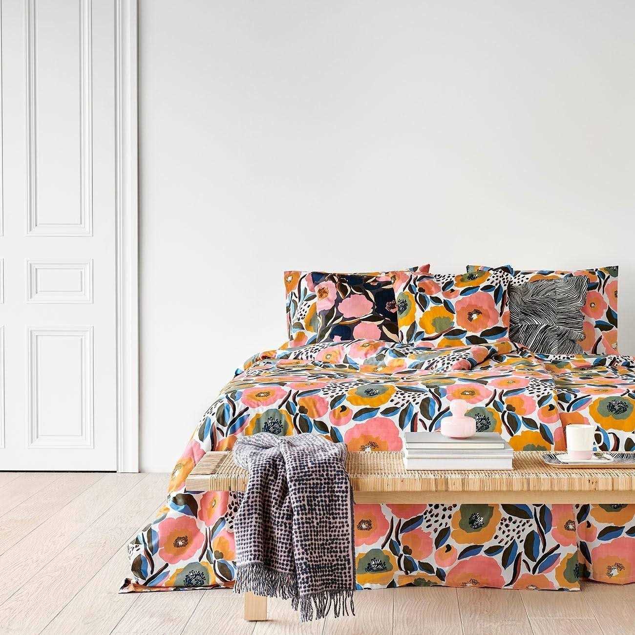Breathe some new life into your bedroom design with the Rosarium Comforter Set by Marimekko. This set includes a comforter and matching shams. Each piece is woven from premium 200 thread-count cotton with an orange, red, and green rose print pattern. The comforter is stuffed with polyfiber to ensure lasting warmth and comfort. Each piece is conveniently machine-washable. Choose among the available size options to best match your needs.