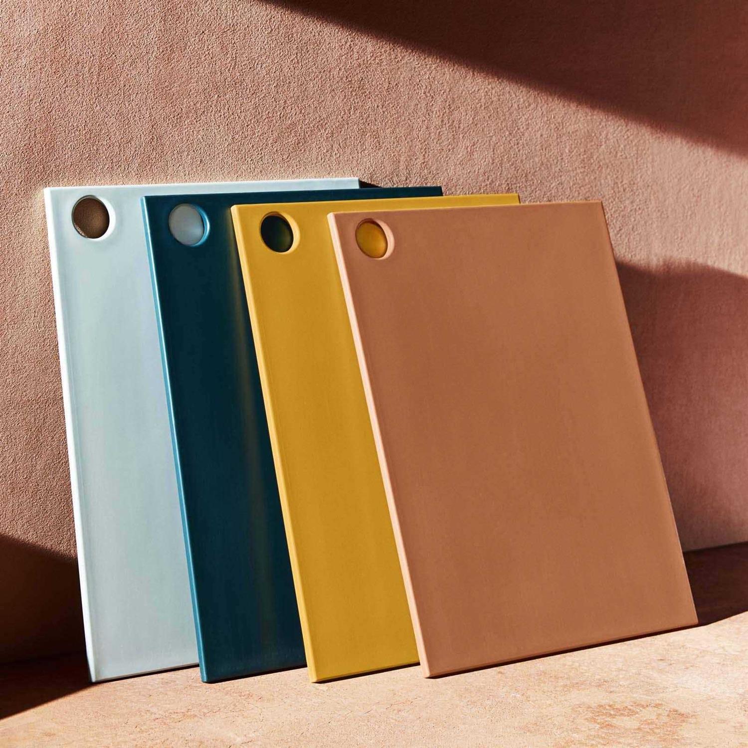 • These colorful BPA-free cutting boards are made entirely of kitchen plastic scraps and renewable sugarcane.