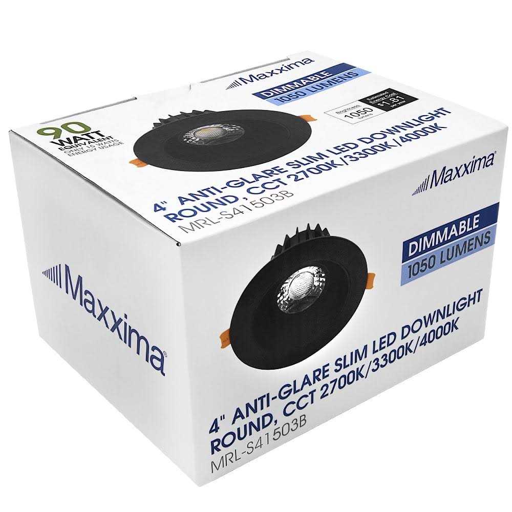 Maxxima 4 in. 5 CCT Slim Round Recessed Anti-Glare LED Downlight, Black Trim, Canless IC Rated, 1050 Lumens, 2700K-5000K