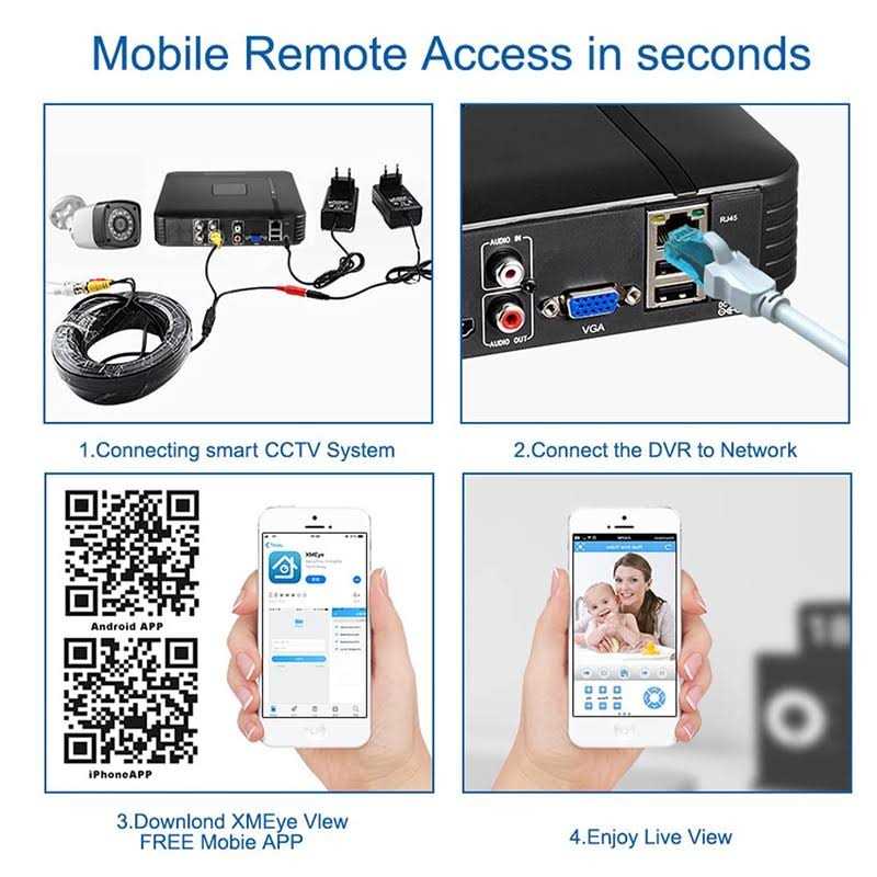 Feature: √ Support H.264+(Quasi H.265) encoding, ultra-low bitrates, compatible with H.264 surroundings; √ Support VGA, HDMI full HD output simultaneously; √ Support ONVIF; access third party; √ Support web, CMS, center platform management software;MYEYE, provide SDK development; √ upport various mobile monitoring (i – Phone, Android);Remote Access, With DNS (ARSP),easy to monitor remotely √ Support UTC, control signal& video stream transmit through one single coaxial √ Support AHD/TVI/CVI/CVBS/IP five signals; √ Support XVI,image quality is better. – Support multi languages. Data Encryption, Cyber Security . All devices passed the severe testing of UL, ensuring the whole system is extremely safe to use. The solid housing ensures long lifespan for all-season monitoring. – Besides, all the data is dynamically encrypted and safe. With or Without the Internet This NVR can be used without being connected to the internet for local recording and live viewing. However, an internet connection is required to enable remote viewing, motion push notifications. Smart Motion Detection Alerts Alarm information pushed to your phone. Receive instant app pushes and email alerts with snapshots upon there are motion events. Get alerted only when it matters without staring at the app all the time. – Motion events are specially identified thus you can find the video you want easily. Remote Access with Free “XMEye” App & Client . With free “XMEye” App and Client, you can access the DVR for remote live stream & playback via your smartphone, tablet or computer wherever. Easiest Plug & Play in Seconds . Link the CCTV surveillance cameras to the DVR with BNC cables and then power on the whole system to start instant 24/7 recording, perfect for DIY lovers. . Connect the DVR to a TV or monitor with the HDMI or VGA output to get local live stream without limitation.