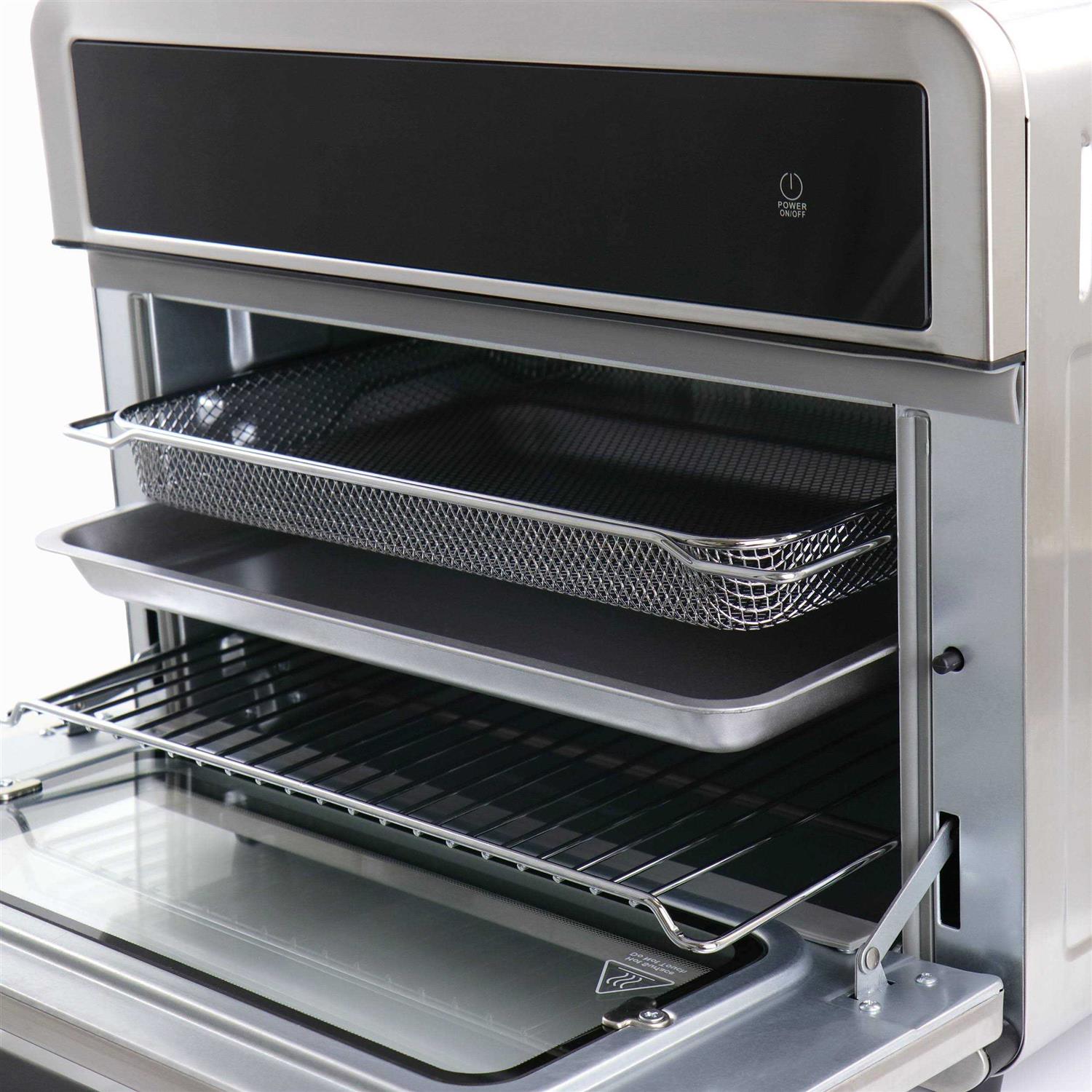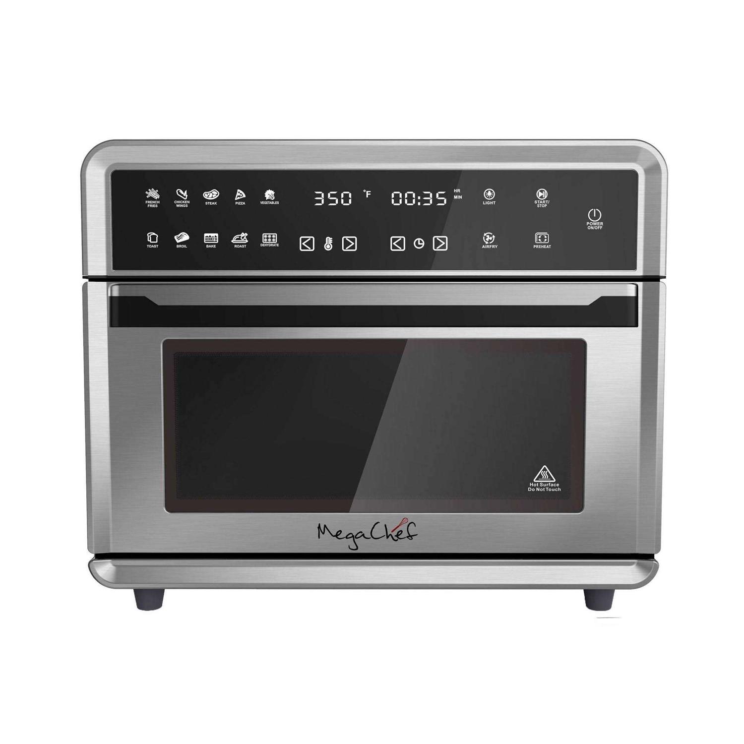 With the mega chef electronic multifunction 3600 degree hot air countertop oven, you can do so much more. Beautifully engineered design has convenience and precision in mind with 10 preset functions that will take the guessing game out of cooking. Extra versatile digital touch display and 10 preset functions: French fries, chicken wings, steak, pizza, vegetables, toast, broil, bake, roast and dehydrate. Powerful 360 degree hot air circulation technology for faster and more even cooking. Six heating elements cook food evenly by circulating hot air within the oven up to 40% faster for more efficient and more healthier cooking. Large 25l size capacity for whole chicken and frozen pizzas, but sleek and compact to complement any kitchen. Easy cleaning with the nonstick interior and removable bottom.