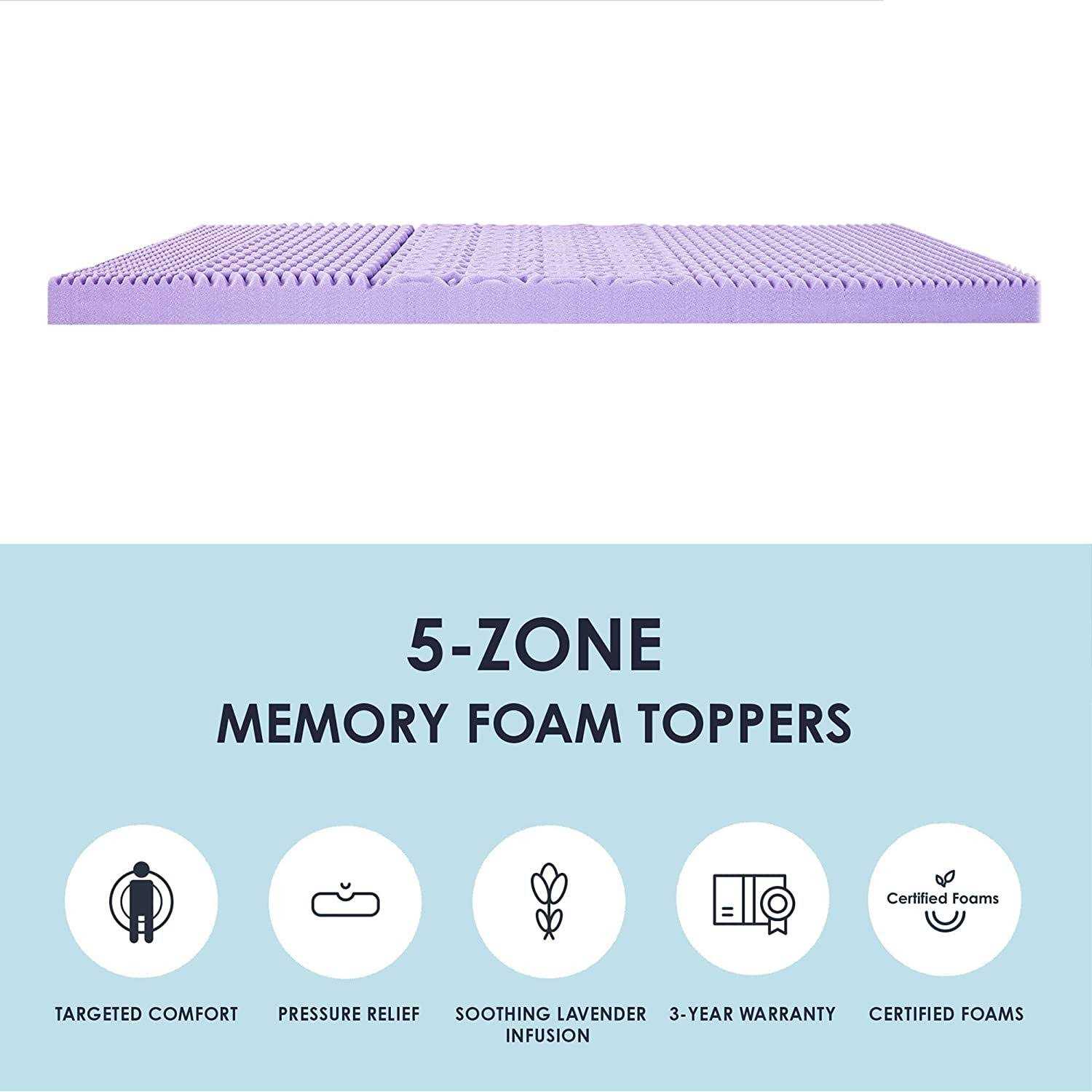 Mattress Toppers by Mellow. Details:Best Price Mattress’ New 5-Zone Lavender Bed Topper is a 3 Inch CertiPUR-US certified, premium memory foam mattress topper for maximum comfort and better sleep. Product features a 5 Body Zone with different point of contact to better prevents tossing and turning. Its breathable memory foam layer is also infused lavender for calming and relaxing scent.