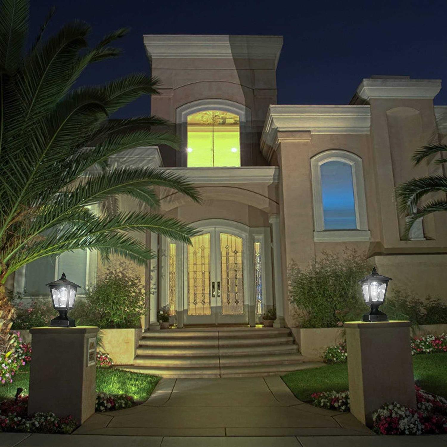 Weatherproof Designthe Fence Post Solar Lights Can Work Normally Under All Kinds Of Weather, No Worries About Rain, Snow, Frost, Or Sleet. It Will Withstand Harsh Heat, Heavy Downpour, And Snow. You Can Rest Assure To Use, In Any Outdoor Environments. Solar Post Lights Outdoorthe Solar Post Lights Made Of Hight Quality Plastic And Bright With 15 Lumens Led. The Solar Lamp Post Lights Has A Retro Classic Lantern Shape That Is Perfect For Garden Decoration.the Fence Post Solar Lights Can Completely Cover 4×4 Wooden Posts Or Above 4×4 Post Flat Surface (Note:our Base Can’t Cover 5×5 6×6 Post) Solar Powered Post Lightsthe Solar Post Cap Lights Has 4 Update Solar Panels, Powered By Solar, Charged In Full And Direct Sunlight For 6-8 Hours, The Lights Automatically Turn The Lights On At Dusk And Off At Dawn. It Is Energy-saving, Efficient And Simple Disassembly. Easy To Installusing The Included Screws, The Solar Post Lights Can Be Easily Installed On The Railing, This Solar Post Cap Light Does Not Require Any Wiring And Is Entirely Maintenance-free. Before You Use The Post Light First Time, Please Put It In A Sunny Place To Charge It For More Than 12 Hours. Light Your Patio And Lifethe Outdoor Solar Post Lights Perfect For Driveway, Walkway, Sidewalk, Posts, Decks, Patios, Fences, Around Your Patio Or Porch.also You May Also Choose To Mount It On Outdoor Tables And Other Flat Surfaces.
