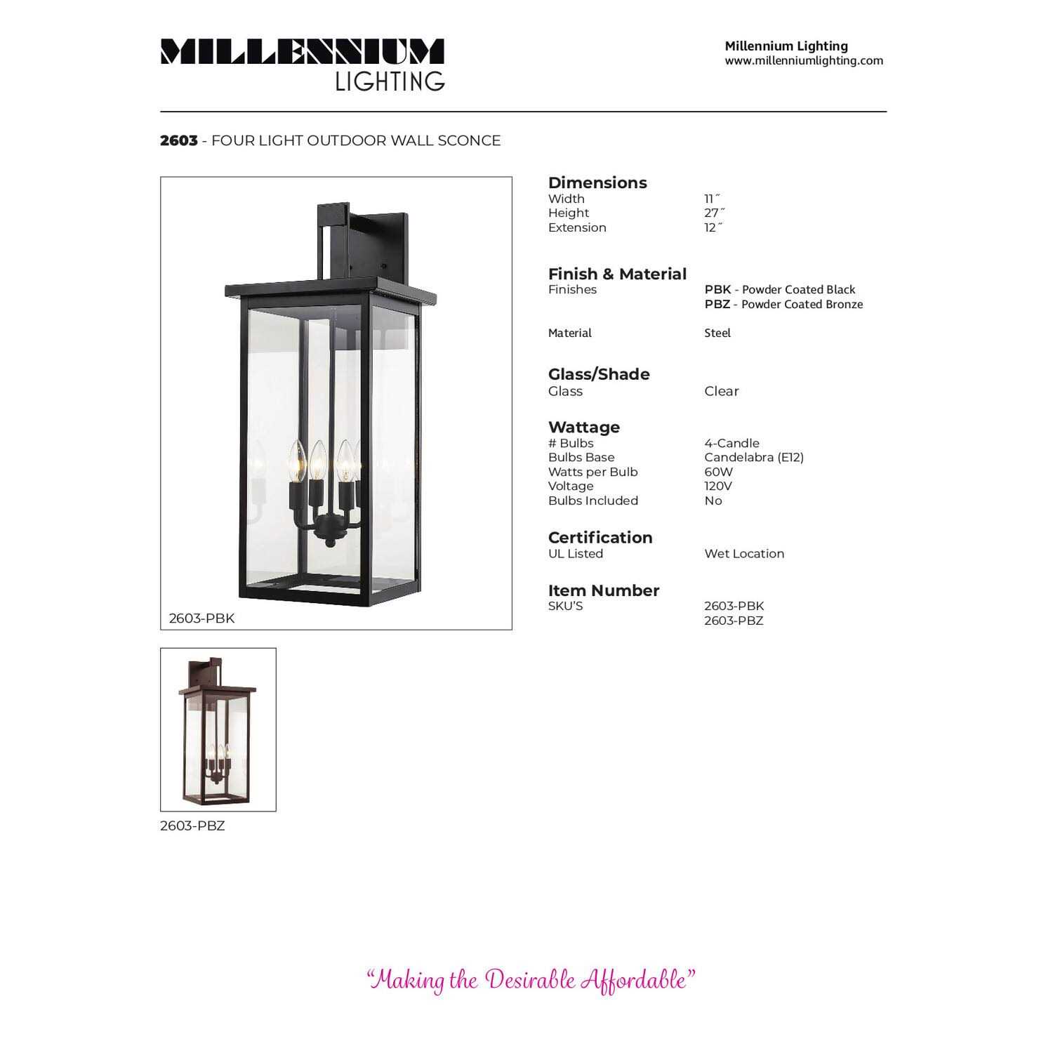 Millennium 2603-PBK Transitional Four Light Outdoor Wall Bracket Finish, Powder Coat Black