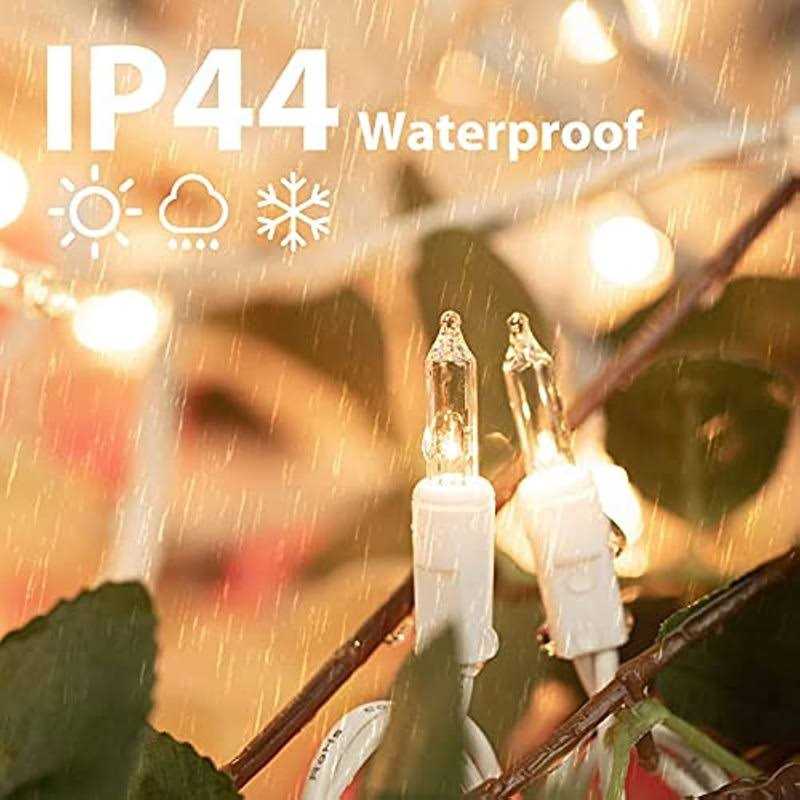 Creative Mini Christmas Lights Set: This Christmas light on white wire set includes 100 transparent mini-lights, total length 26.5 feet white wires, and each bulb is 2.5 inches apart. It can be connected end-to-end to meet your decoration needs, up to 5 creative light strings Premium & Safe: The incandescent mini Christmas lights are made of high-quality material and superb craftsmanship, built-in fuses, universal UL listed certification, can be used safely, perfect for Christmas tree, indoor, outdoor, party decoration Eye Protection Warm White Light: The mini indoor Christmas lights set comes with eye protection warm white light and white line, which is great for tree, bedroom, balcony, garden decoration. These 360o sparkling string lights can not only provide good lighting effects but also bring a more romantic festive atmosphere Independent Lighting & Durability: Each of the light is independently illuminated and does not affect each other. Turning off one light will not cause the other lights to go out, which is very user-friendly. This standard grade mini strings are extremely durable and have an average life of 2,500 hours Easy to Install: The Christmas light sets come with 1 spare fuses and 2 spare bulbs for easy replacement. This mini Christmas light can be connected end-to-end and can be extended to a longer connection length, making it be suitable for different decoration needs. It can be easily installed without additional tools