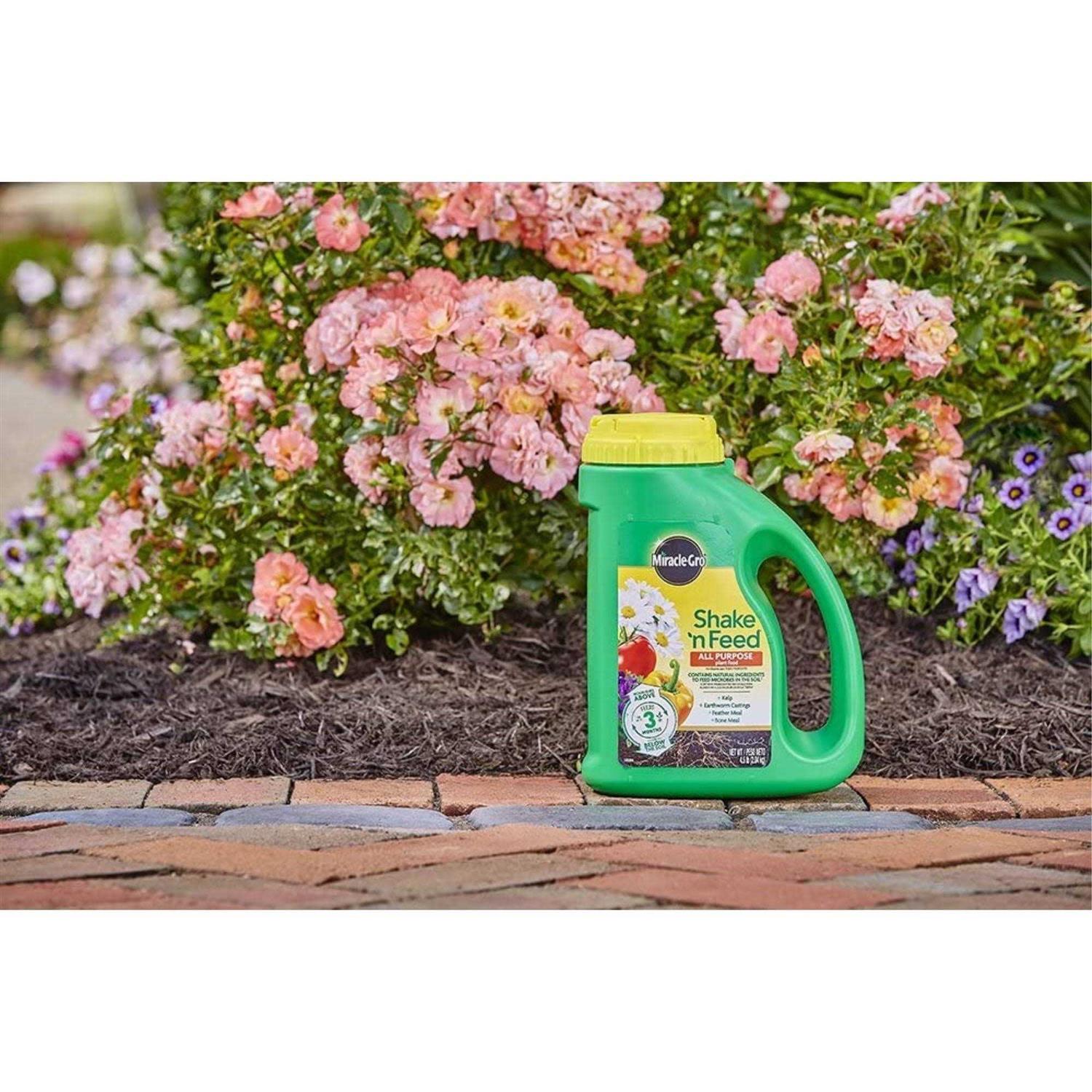 Miracle-Gro Shake ‘n Feed All Purpose Plant Food is specially formulated to help grow stronger, vibrant and more productive plants (versus unfed plants). It contains vital micronutrients, plus added natural ingredients, to nourish above and below the soil. Use in ground and in containers for feeding up to 3 months.