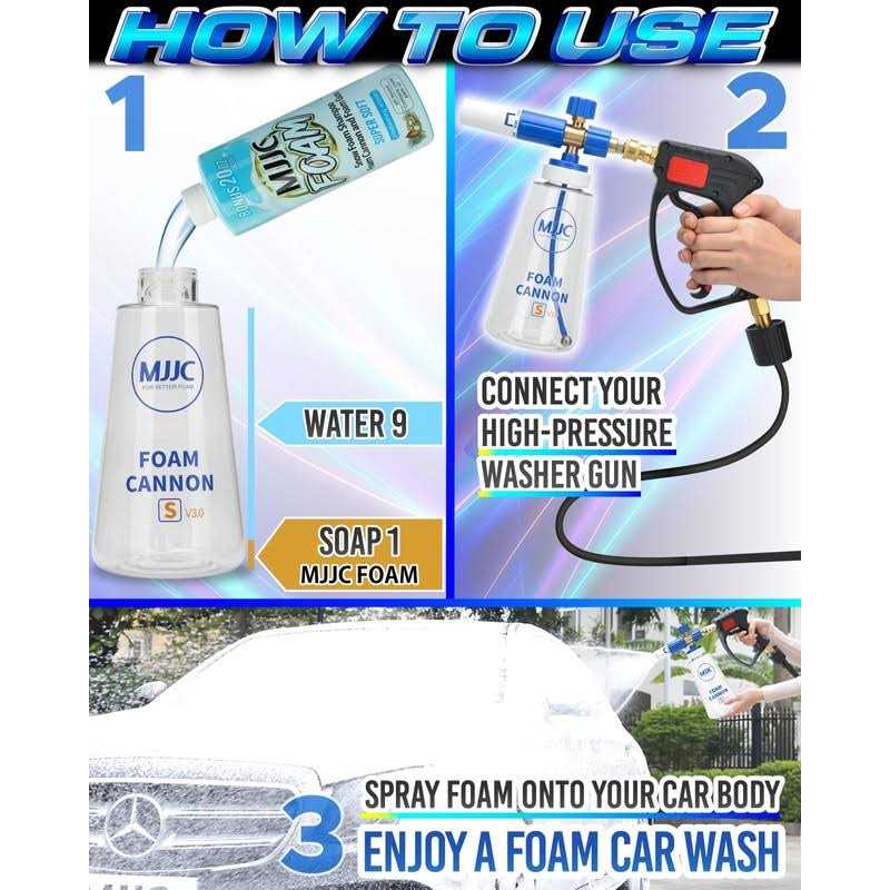 Accessories by MJJC. Details:Foam Cannon S V3.0 are new generation Foam Cannons, powered by MJJC’s new generation foam technology. This new technology is stronger and creates more, thicker foam with less soap, even with smaller pressure washers. They have a better connection system. This allows them to attach to your pressure washer easily, and makes changing attachments easier and faster. Simply put, they are better, stronger, and save you soap, while creating more foam, making it easier and quicker to foam your vehicle.