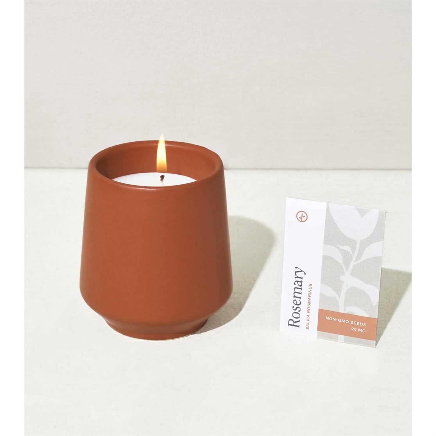 A 6oz soy-blend scented candle is outfitted in a matte glazed ceramic vessel and includes an organic seed packet to grow plant once the candle has been burned down. Candle and seed packet are packaged inside a beautifully designed box for easy gifting. Plastic-free packaging. 42 hour burn time.