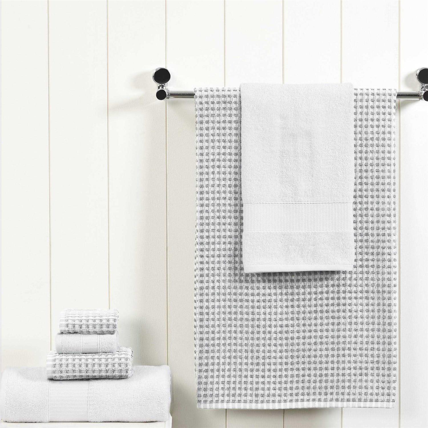 With the popularity of waffle fabrics and weaves, this towel set was inspired by the casual subtleties of easy living. A beautiful textured jacquard design with two tone appeal will enhance any bathroom. Soft tonal combinations in the jacquard towels are paired with a solid terry coordinate towel set for the perfect look. The solid towels have a simple dotted ticking stripe dobby that mimics the jacquard design in a smaller scale for great balance. Absorbent and wonderfully soft, your guests will want to take these home with them.