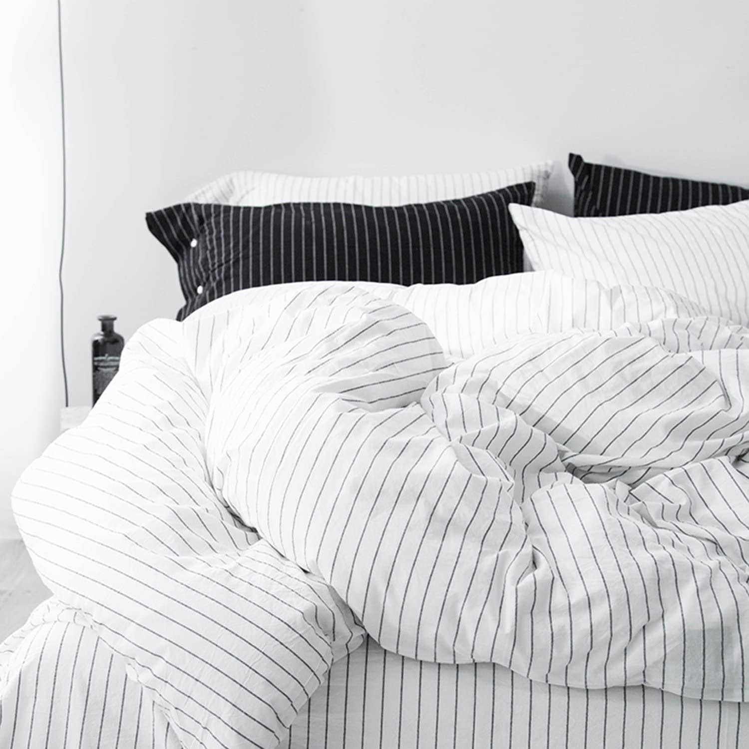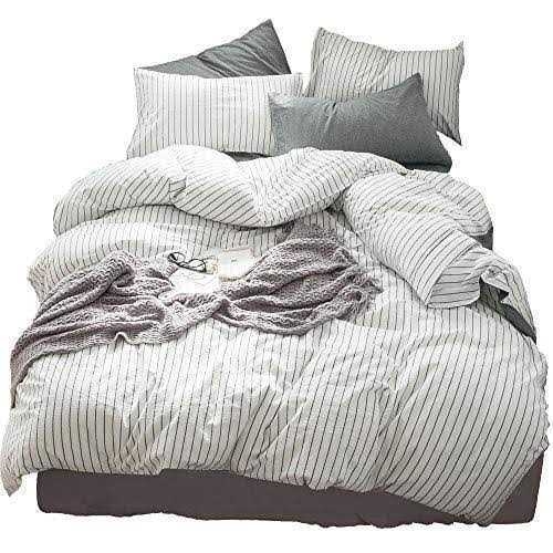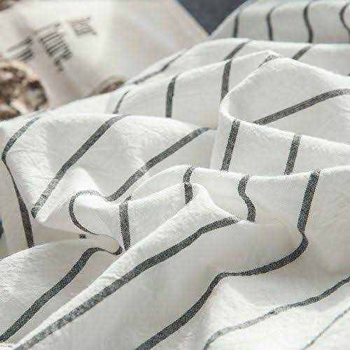 MooMee Bedding Duvet Cover Set 100% Washed Cotton Linen Like Bedding Textured Breathable Durable Soft Comfy (White Stripe, Queen)