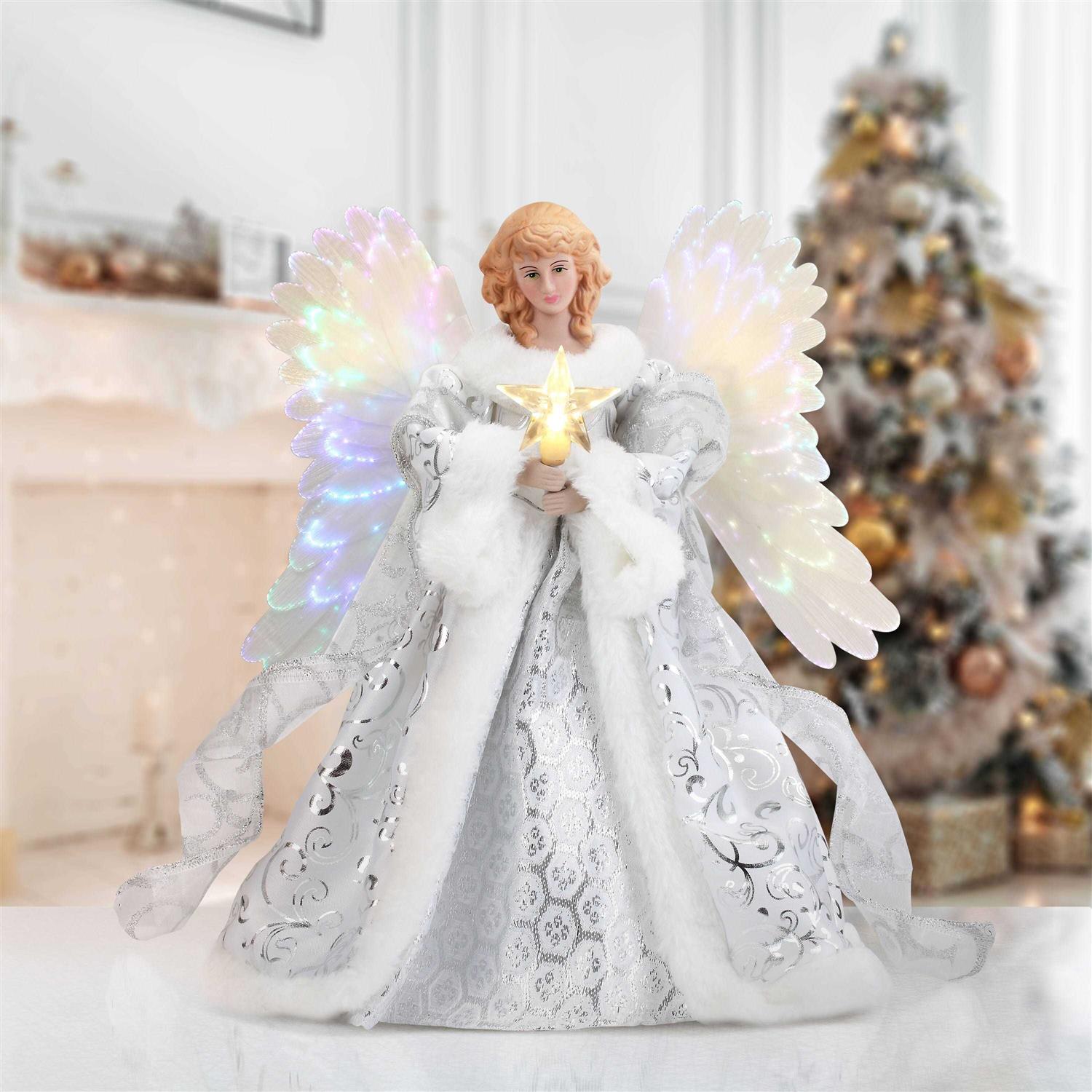 The ultimate finishing touch to your Christmas tee has been modernized with the Animated Angel Christmas Tree Topper by Mr. This beautiful Angel is dressed in a real fabric white dress with gold accents, with matching iridescent wings that move. The Angels animated wings are pre-lit with warm white fiber optic illumination, and she holds a warm white star that shines bright in her hands. This tree topper has a universal design that fits any tree and is adapter operated with a long 10 ft cord for easy installation. For indoor use only this beautiful Christmas Angel is ready to light up your home.