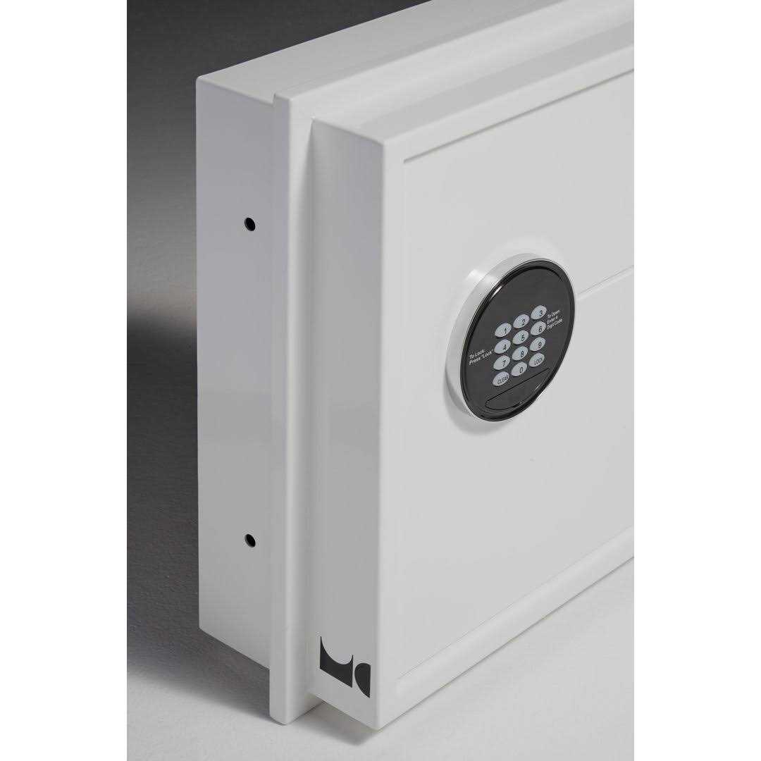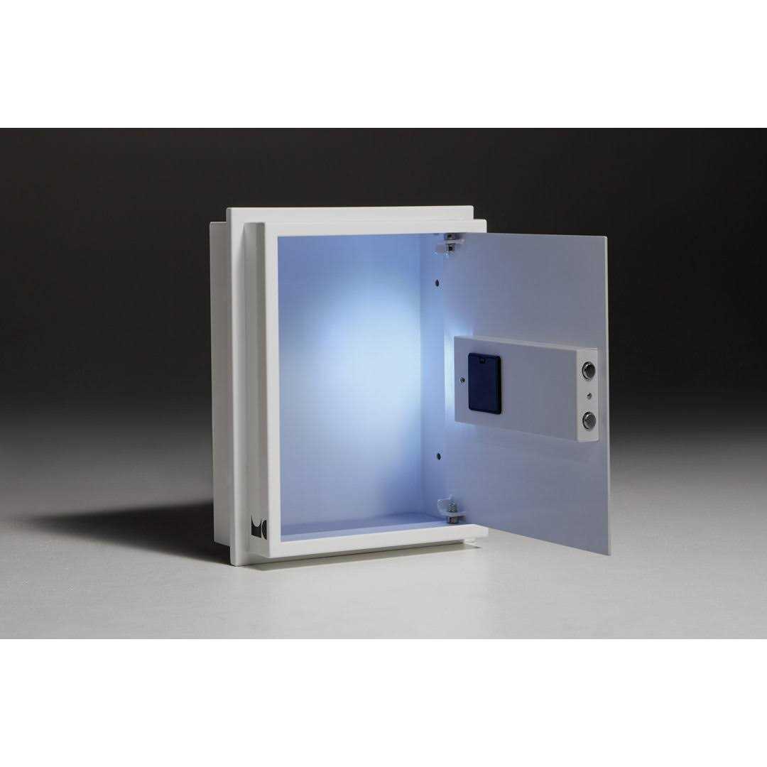 The Mycube recessed wall safe is designed to fit in between two wall studs for extra security and sleek protection. Available in our high-gloss white designer finish, and equipped with four pre-drilled bolt holes for secure installation, 3.5 sits inside the wall and three outside the wall. Four-digit digital keypad runs on 4aa batteries with back up manual key. Intenral light allows for easy visibility isndie the safe.