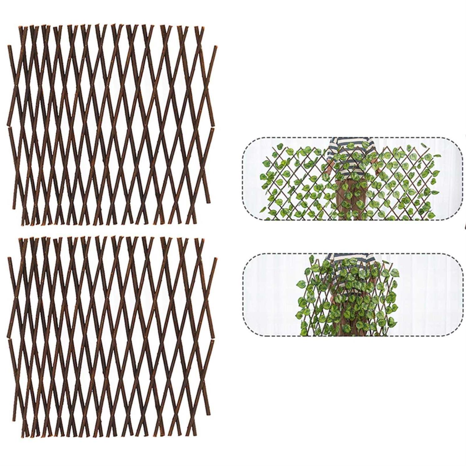 Artificial Hedge Trellis: This expandable faux ivy fence screen are made of wood material, more durable. Easy To Use: Can be expanded to the size you need. Expanded or contracted to your desired dimensions. Closed size: 40*20*5cm/15.75*7.87*1.97inch(L*W*H). Fully expanded size is 200*30cm/78.74*11.81inch(width*height) Plant Frame: The expandable willow trellis can be used as fences, dividers, climbing plant supports, expandable door, trellis. Also is the best support to wrap the led string light to decor your festival Christmas Halloween wall or fence, or hanging other small things,all decide by you, create a better holiday atmosphere. Widely Used: Natural lattice willow trellis can be used as fences, dividers, climbing plant supports, retractable doors, trellis for a perfect climbing plant support . It will be the best natural ornament in your garden. Garden Decoration: Tidy up the yard, beautiful and orderly,make the plants convenient to take care of and clean. Features: Artificial Hedge Trellis: This expandable faux ivy fence screen are made of woodmaterial, more durable. Easy To Use: Can be expanded to the size you need. Expanded or contracted to your desired dimensions. Wide Use: Perfect climbing plant support no matter short or tall plant, also can be used as fences, dividers, expandable door. Plant Frame: Adjustable frame to wrap the led string light to decor your festival party wall or fence, or hanging other small things, creating atmosphere. Garden Decoration: Tidy up the yard, beautiful and orderly,make the plants convenient to take care of and clean. Specification: Material: Wood Color: Brown Cable tie color: random color Quantities: 1pc, 2pcs Size(approx): folding size: 40*20*5cm/15.75*7.87*1.97inch(L*W*H) expanded size: 100*38cm/39.37*14.96inch, 150*35cm/59.06*13.78inch, 200*30cm/78.74*11.81inch(width*height) Package included: 1 *Artificial Hedge Garden Trellis Or 2 * Artificial Hedge Garden Trellis